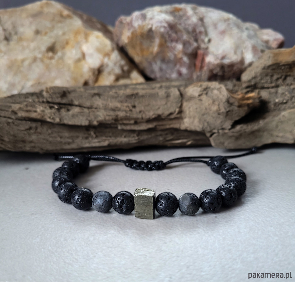 Bardzo męska bransoletka zrobiona z matowych kamieni: surowej bryłki Turmalinu,niebieskiego Howlitu oraz Lawy wulkanicznej.