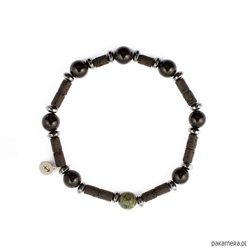Znaczenie kamieni: Hematyt to kamień wojowników. Silnie oczyszcza krew. Budzi radość do życia, dodaje odwagi i wiary we własne umiejętności.Lawa wulkaniczna to kamień oczyszczenia. Wypala nagromadzone w nas negatywne emocje i przekształca je w mobilizującą do działania siłę.Turkus afrykański to kamień podróżników. Pełen energii talizman, wzmacniający odwagę i intuicję podróżujących oraz sprzyjający nowym przyjaźniom.Turmalin czarny to kamień ochrony. Jest wyjątkowym kamieniem, który zapewnia ochronę przed tzw. złym okiem, czyli zazdrością, szkodliwymi intencjami oraz innymi rodzajami negatywnych wpływów, takimi jak obawy, strach i złość.