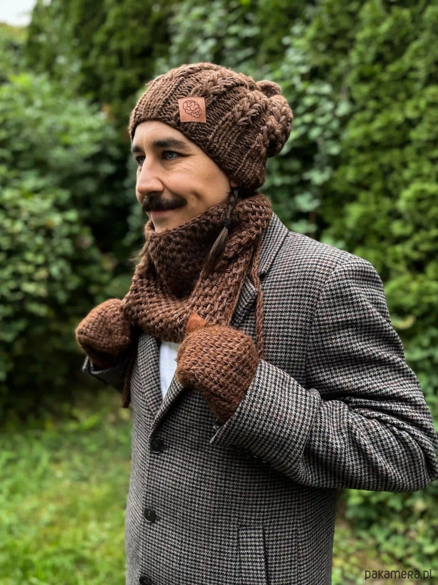 Męska czapka MERINO Smile Brąz + podszewka JEDWAB