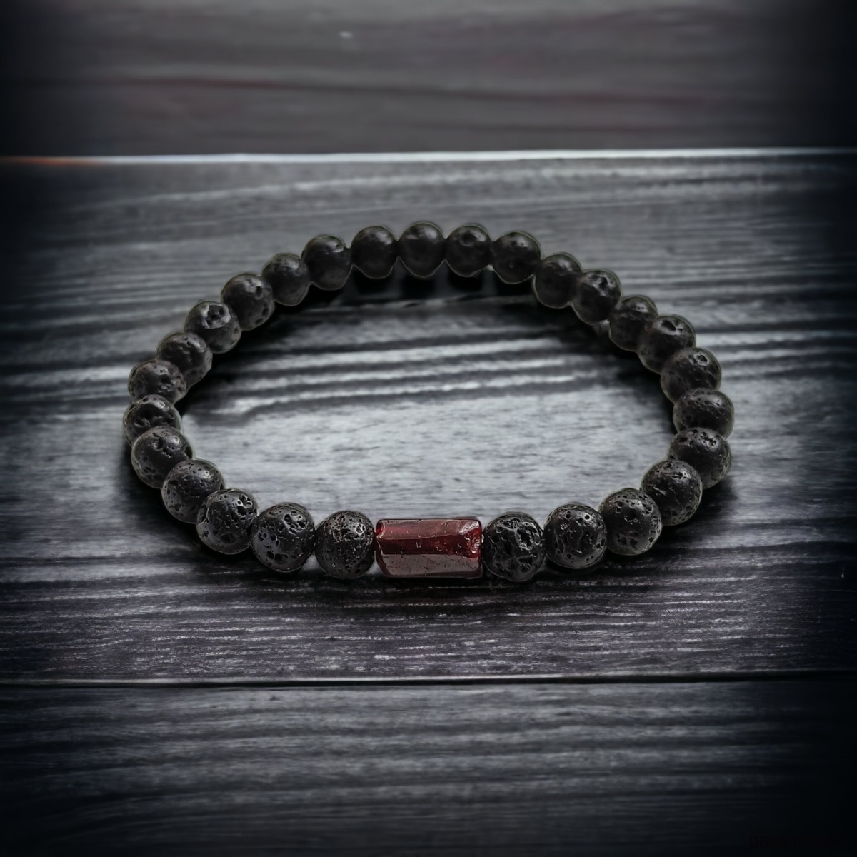 delikatna niezwykle ciekawa bransoletka- talizman wykonana z porowatej lawy wulkanicznej (kuleczki 6mm) i nieregularnej, polerowanej bryłki granatu.
