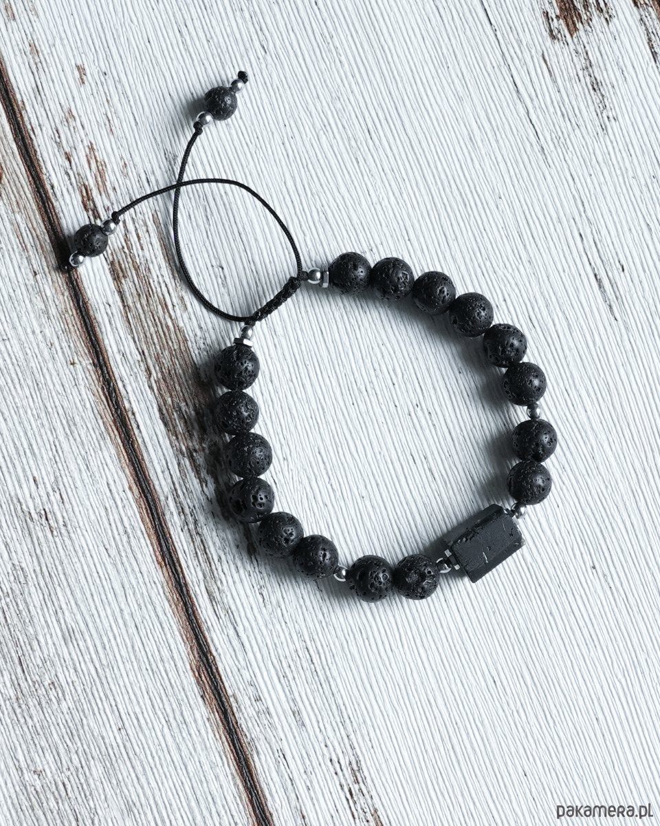 Męska, masywna bransoleta z LAWY WULKANICZNEJ z bryłką surowego TURMALINU o nieregularnym kształcie. Srebrne elementy to HEMATYT.