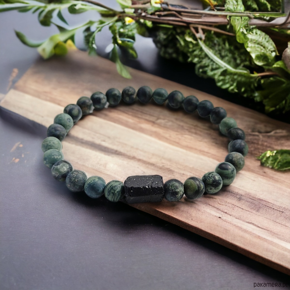 delikatna niezwykle ciekawa bransoletka- talizman wykonana z kuleczek matowego ciemno-zielonego jaspisu kambaba (6mm) i surowej bryłki czarnego turmalinu.na solidnej gumce jubilerskiej. bez elementów metalowych.