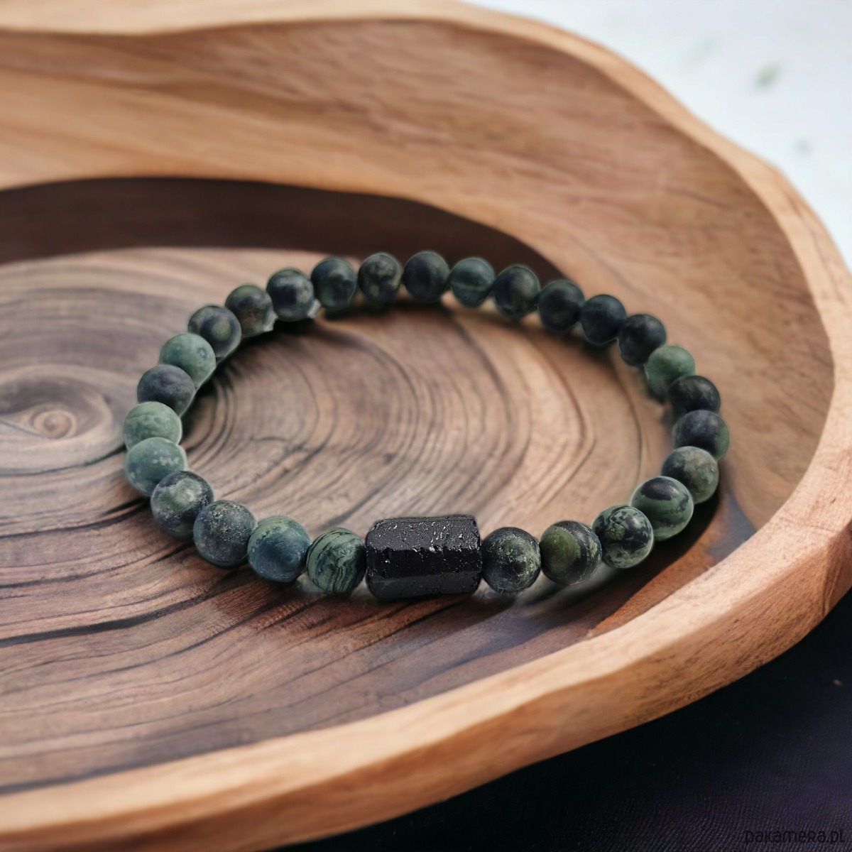 delikatna niezwykle ciekawa bransoletka- talizman wykonana z kuleczek matowego ciemno-zielonego jaspisu kambaba (6mm) i surowej bryłki czarnego turmalinu.na solidnej gumce jubilerskiej. bez elementów metalowych.