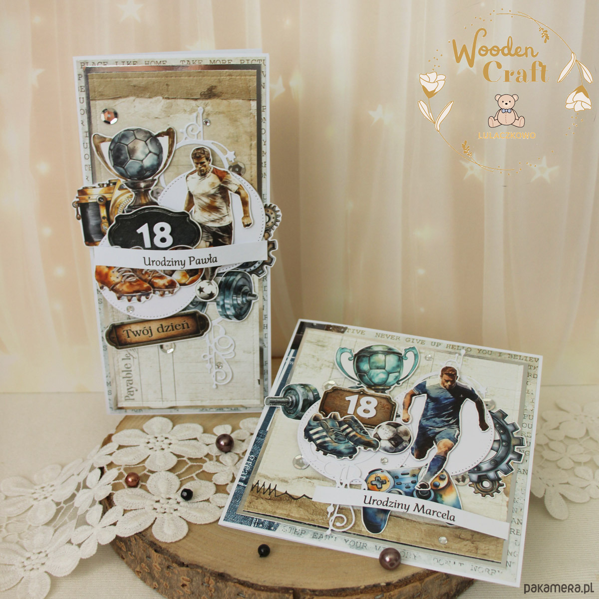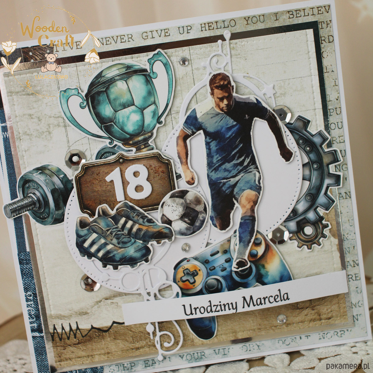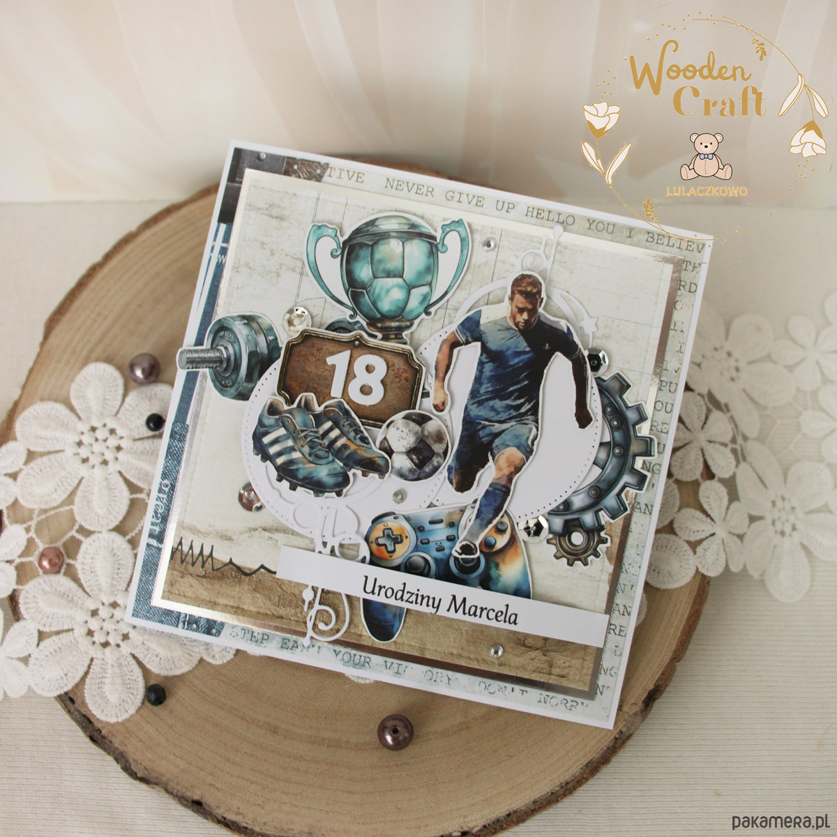 Nietuzinkowa, męska kartka urodzinowa, idealna na 18 urodziny fana piłki nożnej. Utrzymana w odcieniach beżu z dodatkiem błyszczących srebrnych akcentów, zamknięta w białym pudełeczku z okienkiem. Wykonana ręcznie z mixu męskich kolekcji papierów, ozdobiona licznymi grafikami o tematyce piłkarskiej, srebrnymi cekinami, a także napisem "Twój Dzień", imieniem solenizanta oraz cyferką 18.