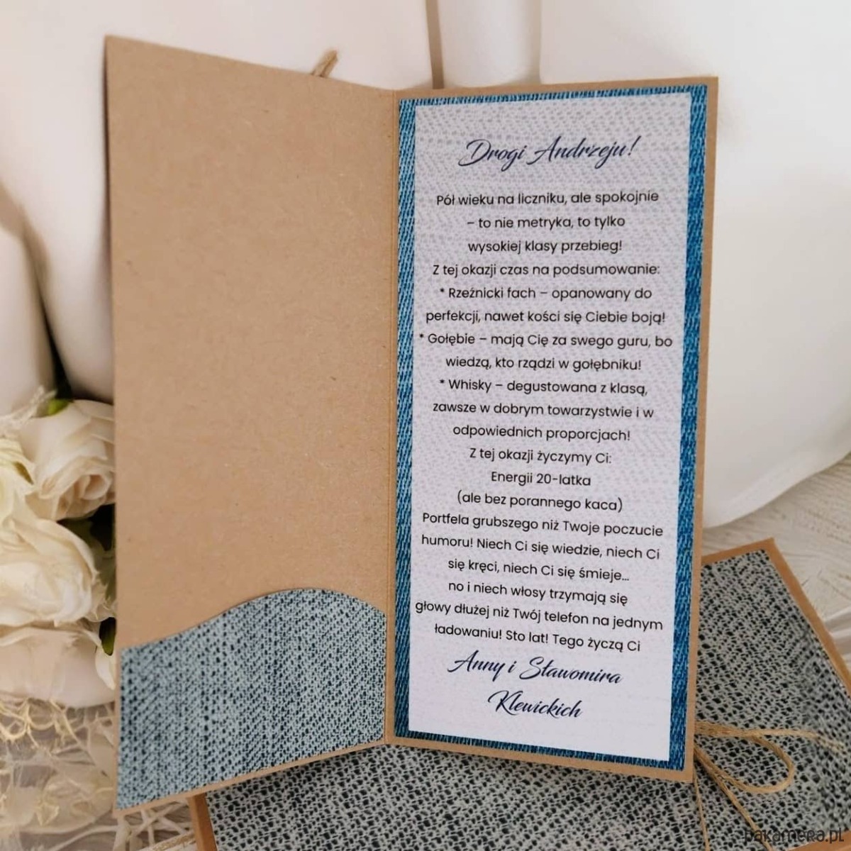 W środku znajdują się życzenia - możesz wybrać tekst taki jak na zdjęciu lub dodać własny. Istnieje możliwość dodania kieszonki na pieniądze lub voucher.