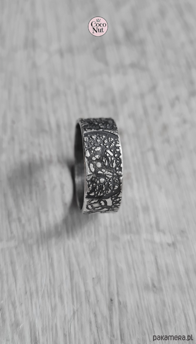 Obrączka ze srebra, szerokość ok. 8-9 mm, po zakupie prosimy podać rozmiar.