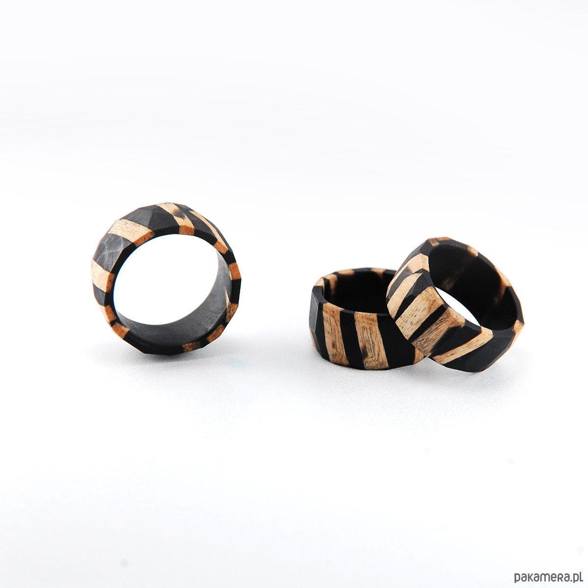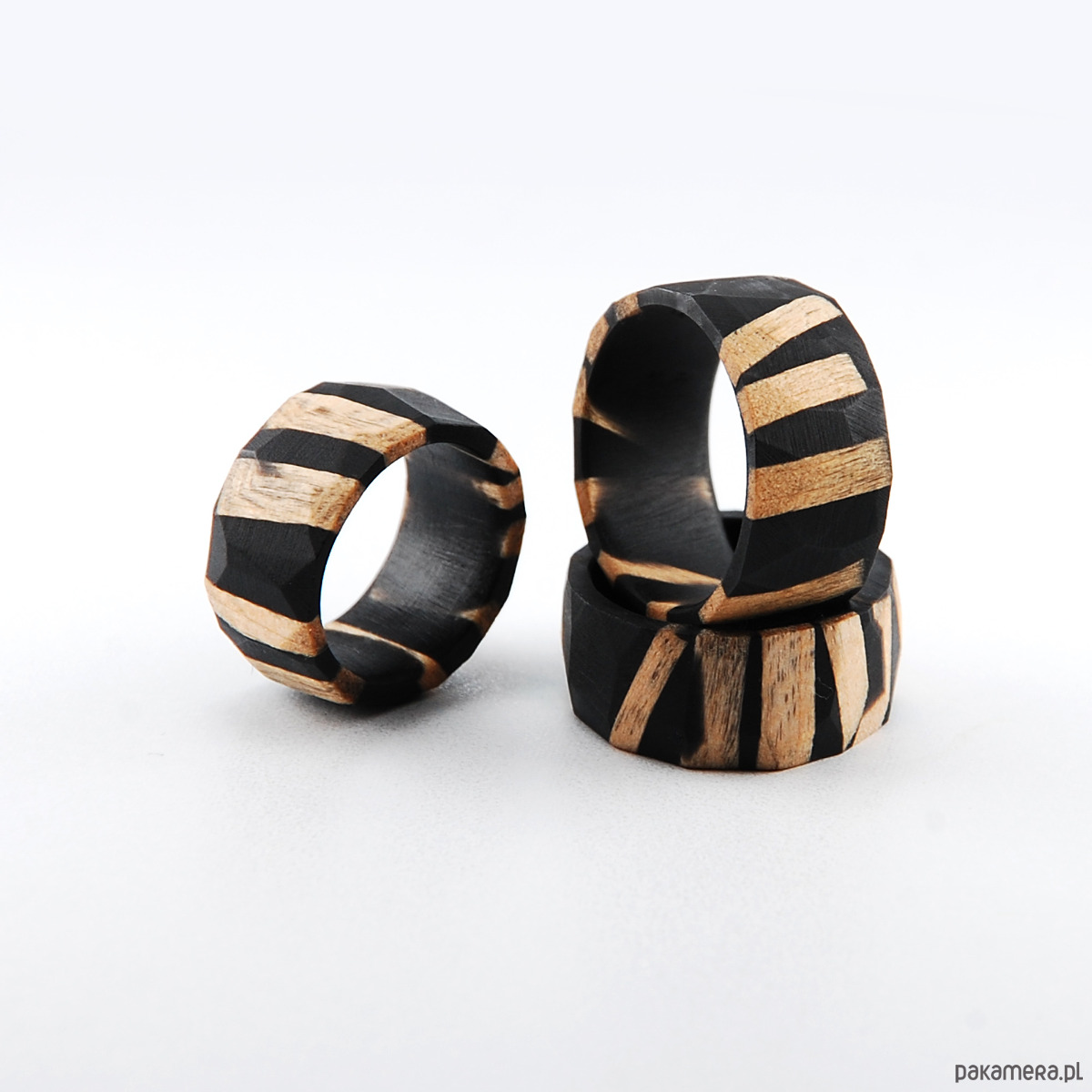 Obrączka z niepowtarzalnym wzorem z pasków drewna lipowego zatopionego w matowej czarnej żywicy, szerokość około 10mm, grubość około 3mm.