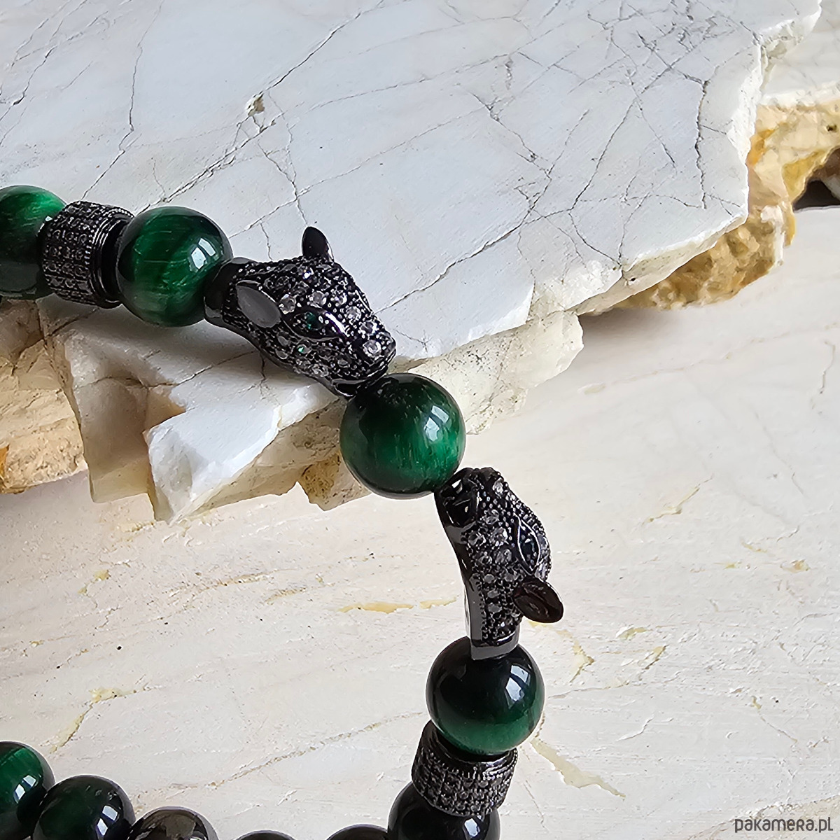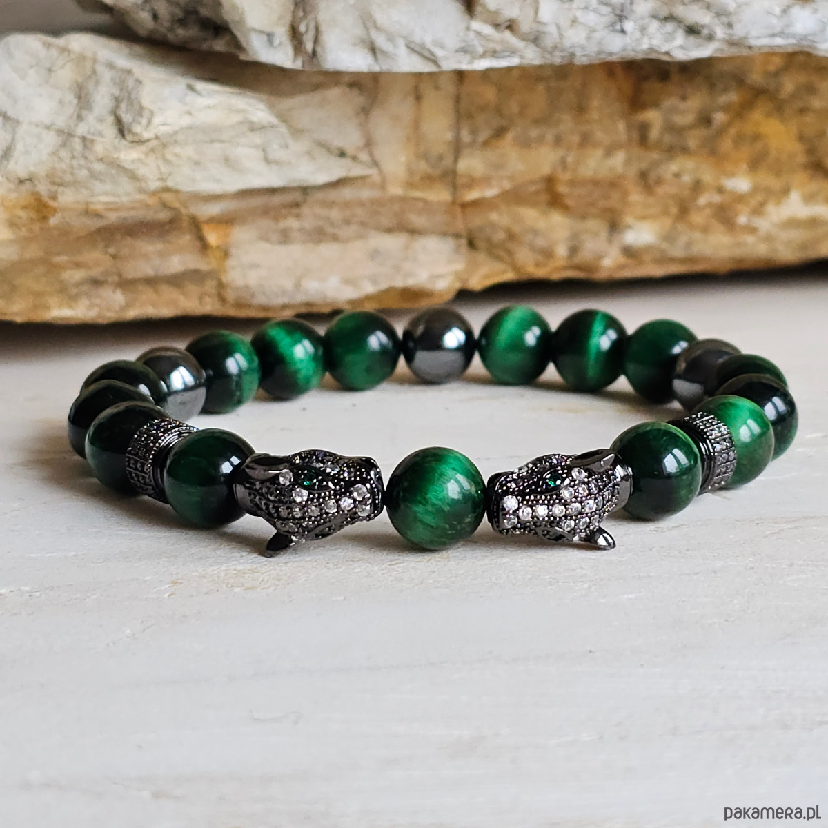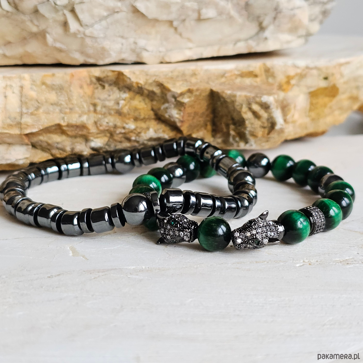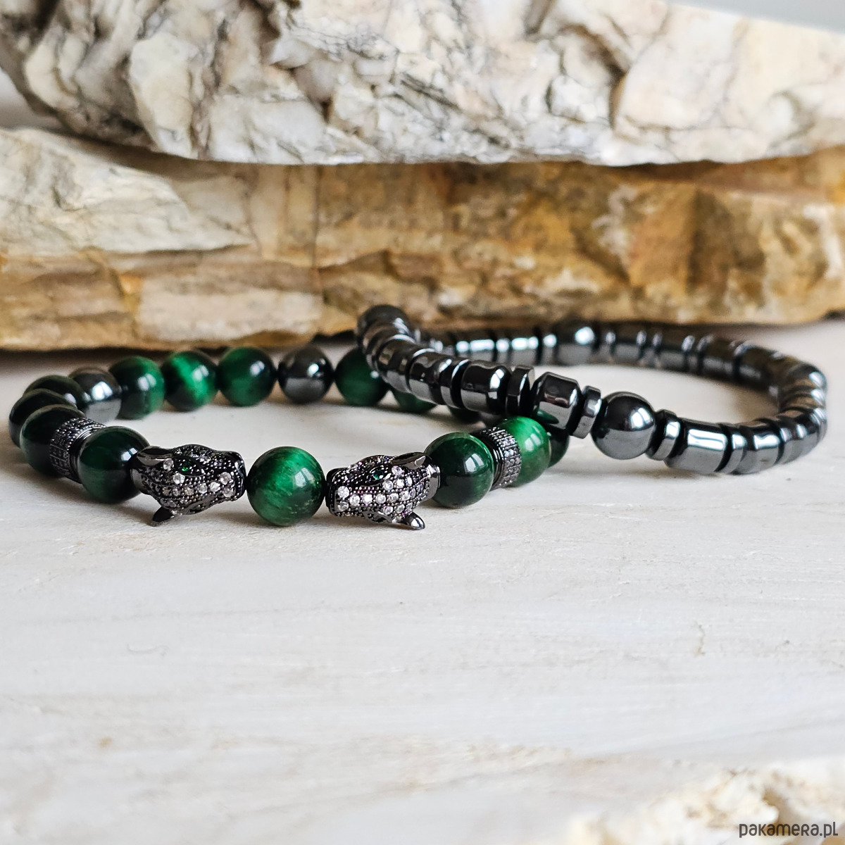 Męska podwójna bransoletka / Zielone Tygrysie Oko / Głowy Panter / Hematyt