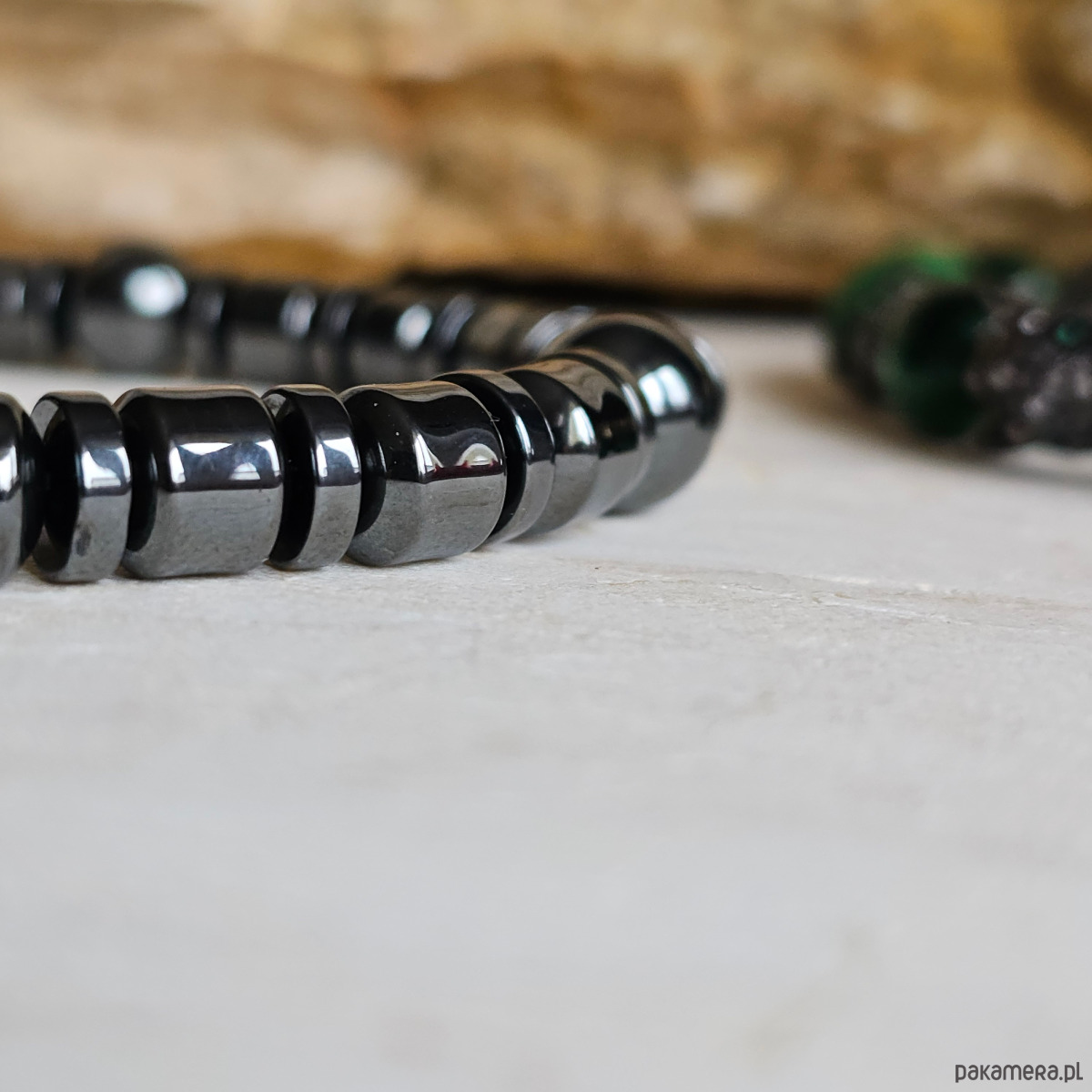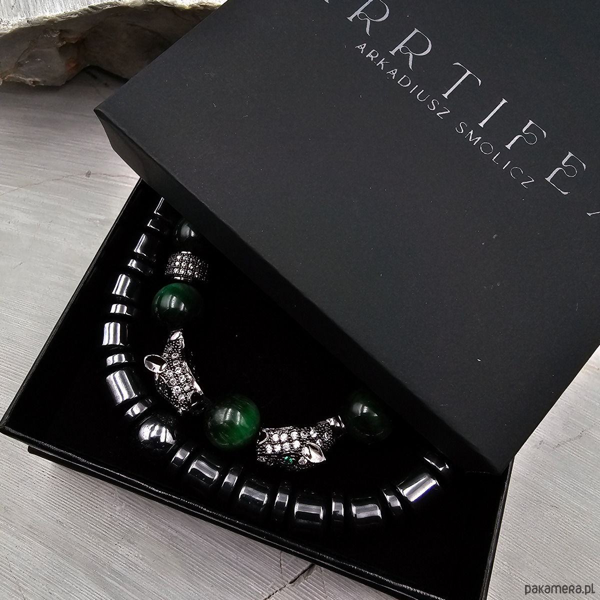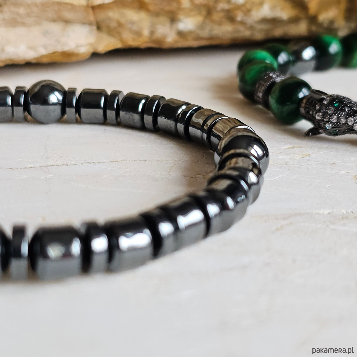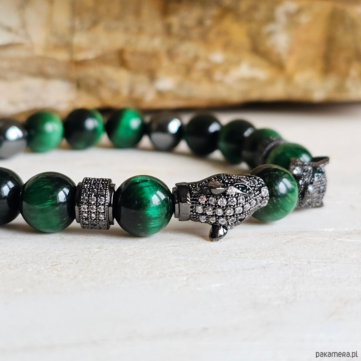 Męska podwójna bransoletka / Zielone Tygrysie Oko / Głowy Panter / Hematyt