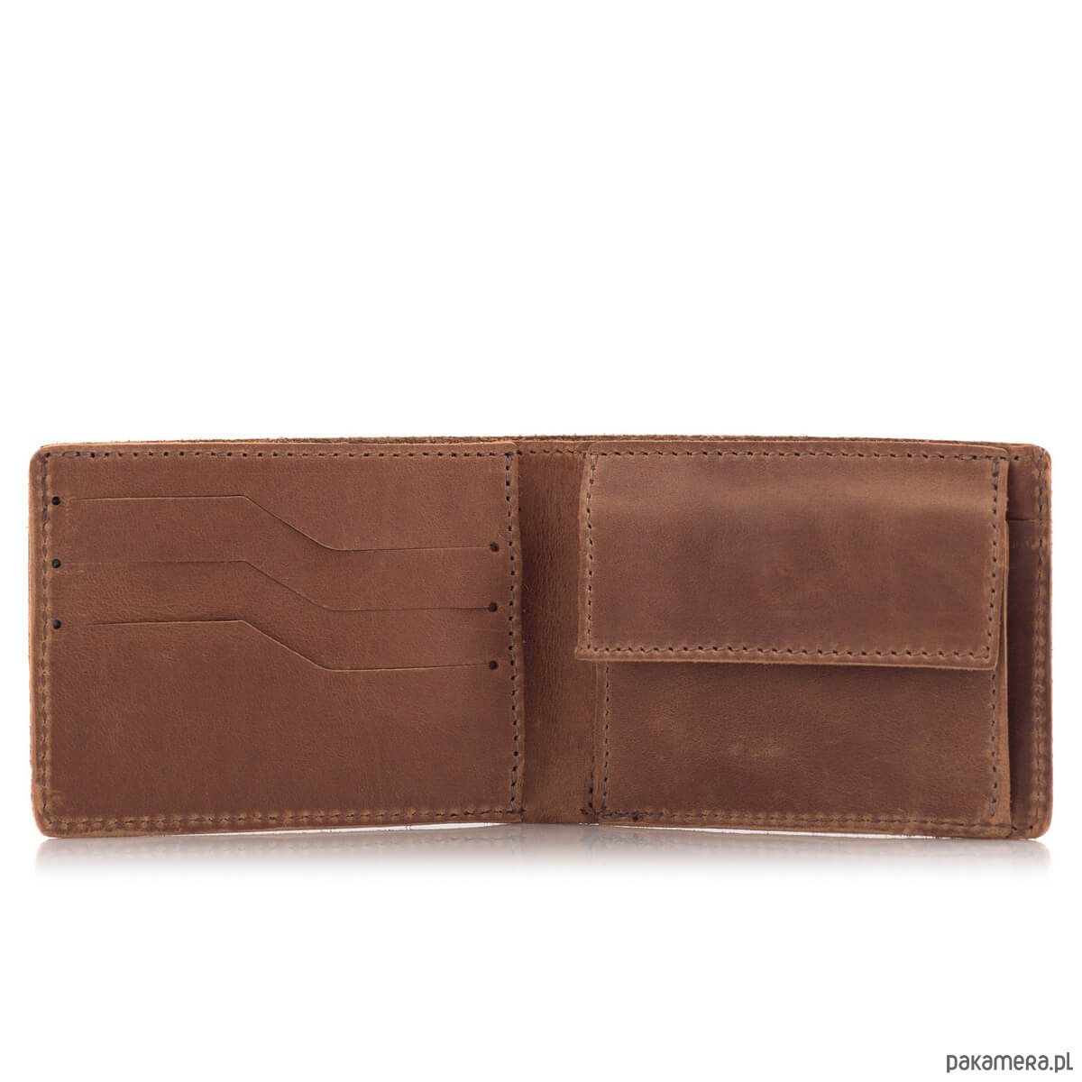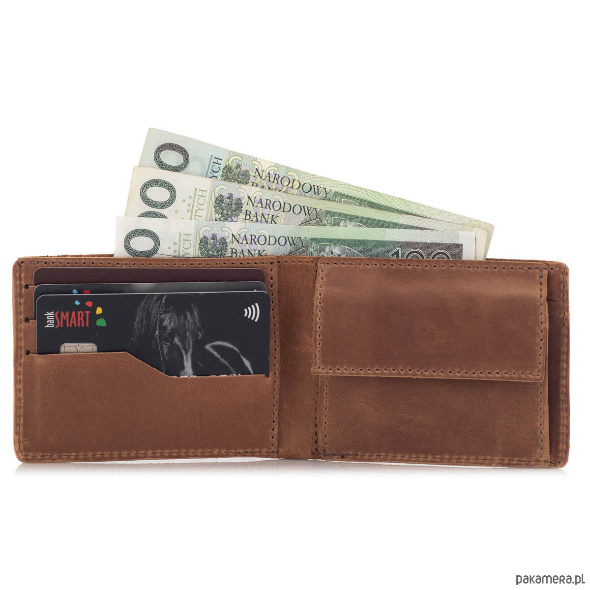 Portfel posiada 3 przegródki na karty kredytowe oraz jedną szeroką kieszeń na banknoty. To idealna ilość przegródek na potrzeby codziennego użytkowania. Znajdziesz w nim też klasyczną bilonówkę na monety, która jest zapinana napem, aby uniknąć przypadkowych wypadków.