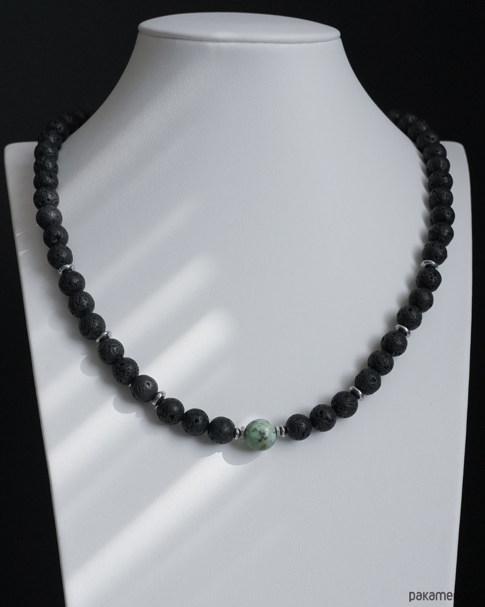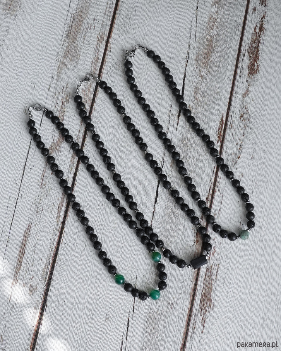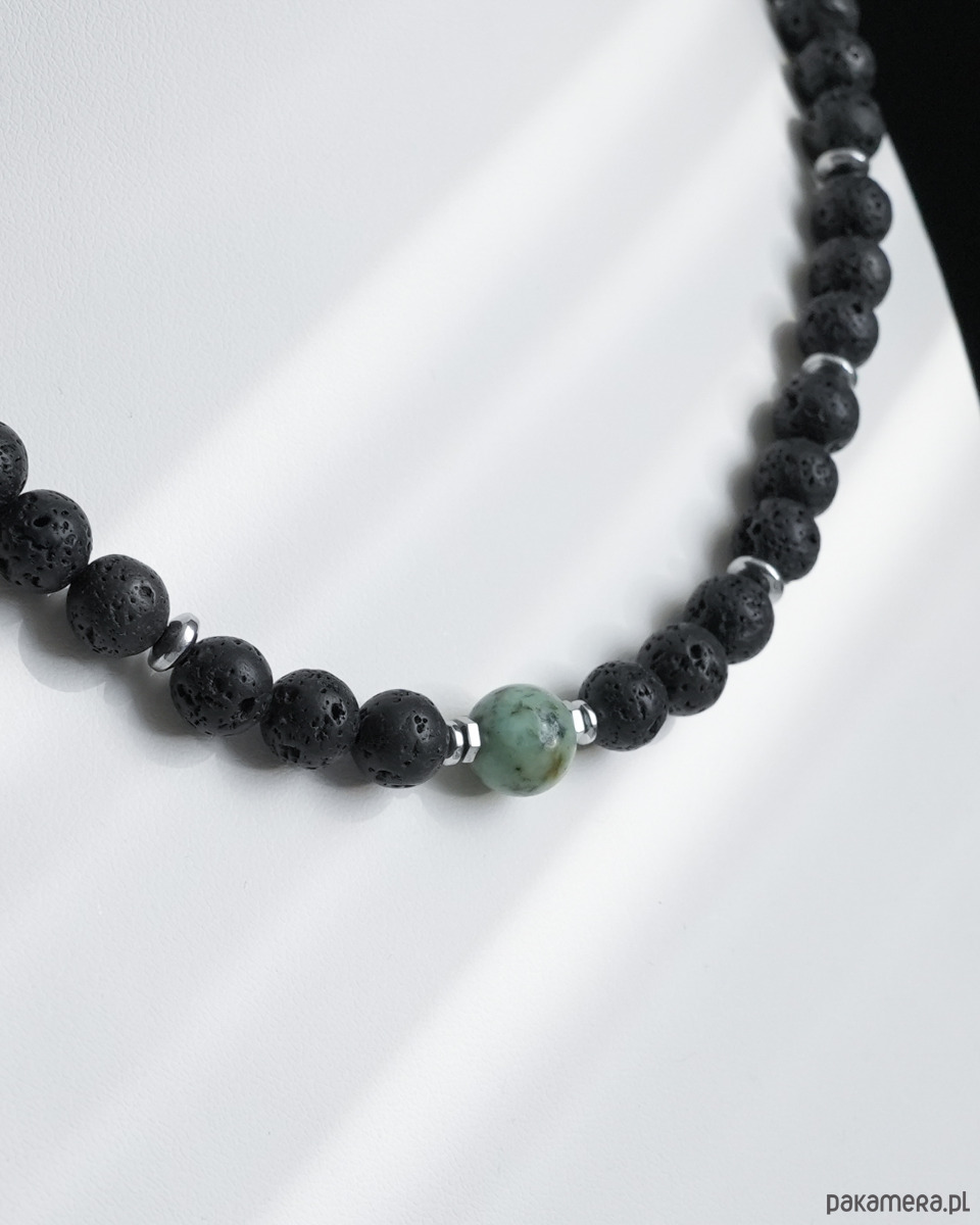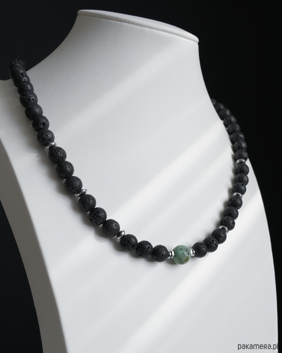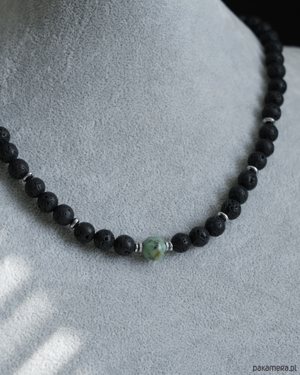 Krótki, męski naszyjnik z surowej LAWY WULKANICZNEJ, zielonego TURKUSA AFRYKAŃSKIEGO oraz srebrnego HEMATYTU. Zapięcie wykonane jest ze srebrnej STALI SZLACHETNEJ. Na życzenie mogę nieco wydłużyć naszyjnik dodając krótki łańcuszek, tzw. przedłużkę (5-6 cm).