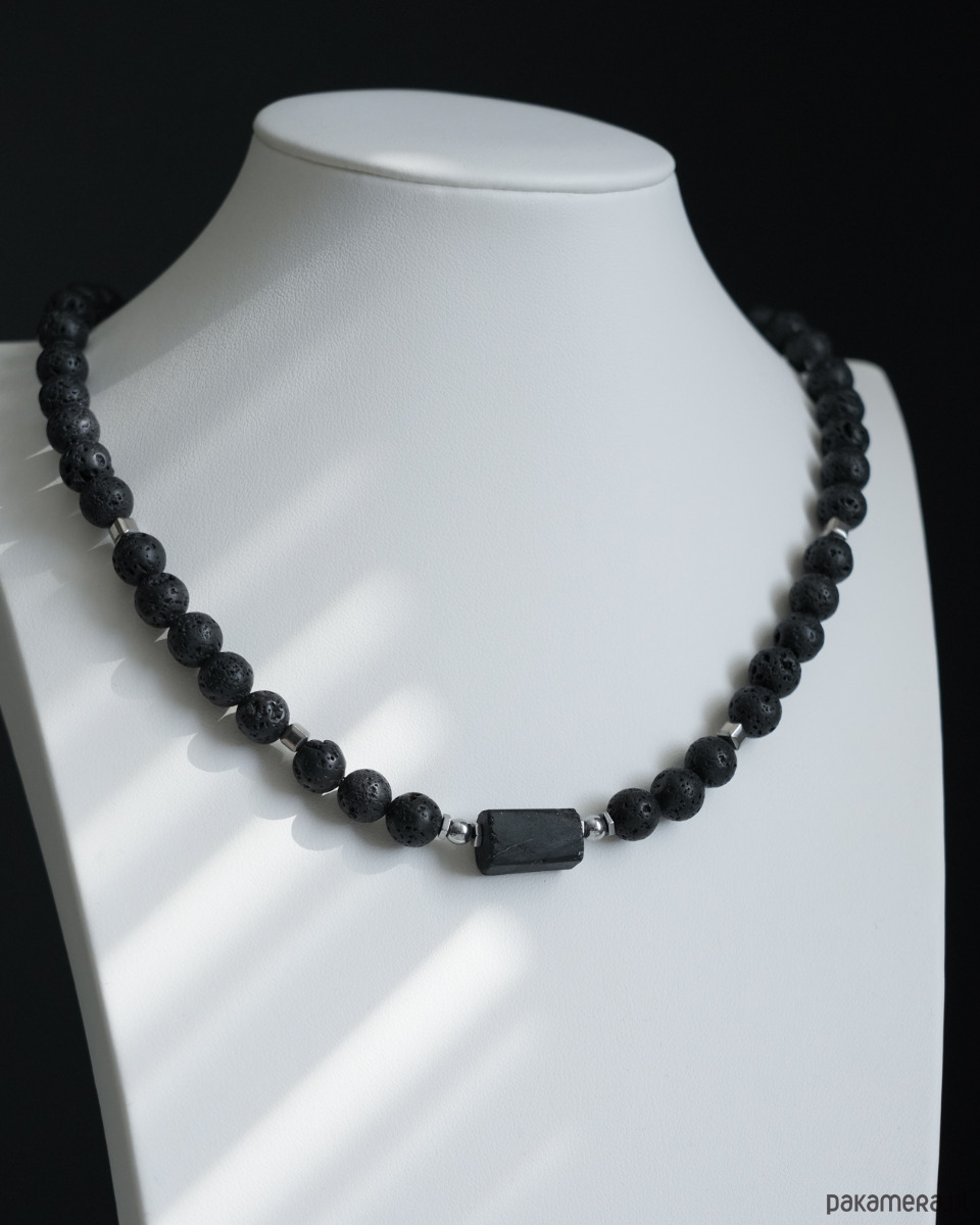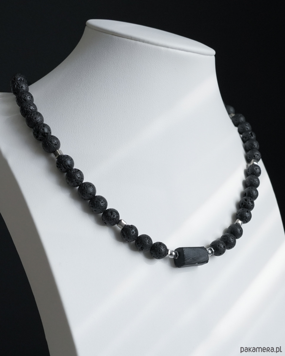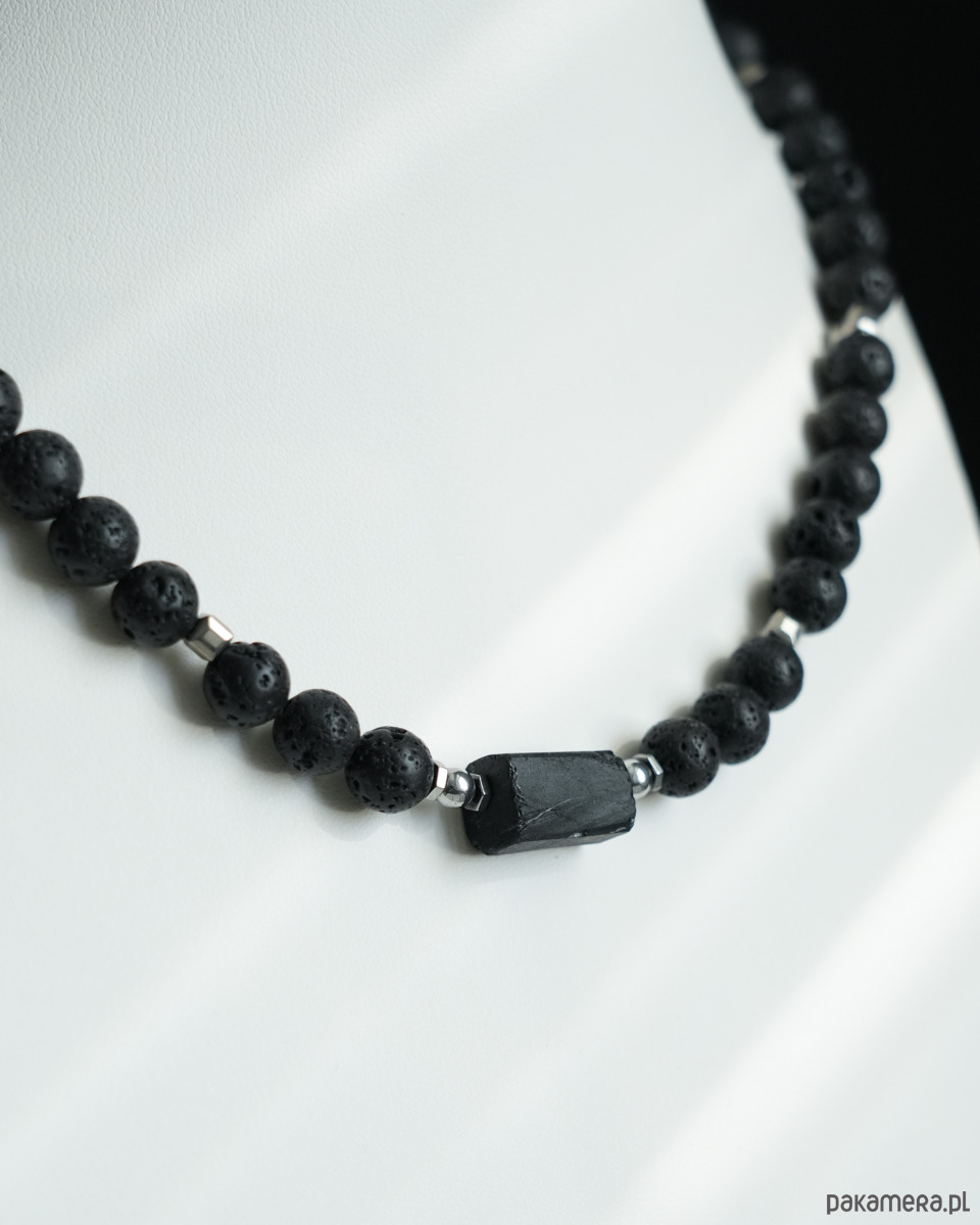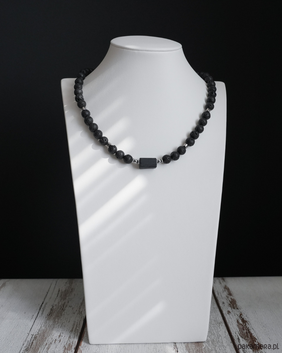 Krótki, męski naszyjnik z LAWY WULKANICZNEJ z bryłką surowego TURMALINU i z dodatkiem srebrnego HEMATYTU w kształcie sześcianu. Zapięcie wykonane jest ze srebrnej STALI SZLACHETNEJ. Na życzenie mogę nieco wydłużyć naszyjnik dodając krótki łańcuszek, tzw. przedłużkę (5-6 cm).