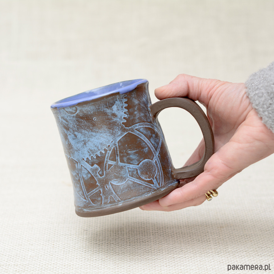 Duży kubek ceramiczny z odciśniętym motywem kół zębatych o pojemności około 350 ml. Kubek ma solidny uchwyt, który wygodnie pasuje do męskiej dłoni. Zestawiłam tutaj ciemno brązową glinę z intensywnie niebieskim szkliwem, a wzór przetarłam dla lekko zużytego wyglądu. Kubek ma wyraźnie mechanicznego ducha :)