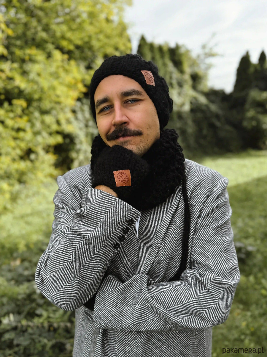 Ręcznie robiony przez poznańskie Seniorki z przędzy premium – 86% merino, 11% alpaki i 3% jedwabiu. Ta mieszanka to ciepło, miękkość i duża dawka luksusu w codziennej formie.