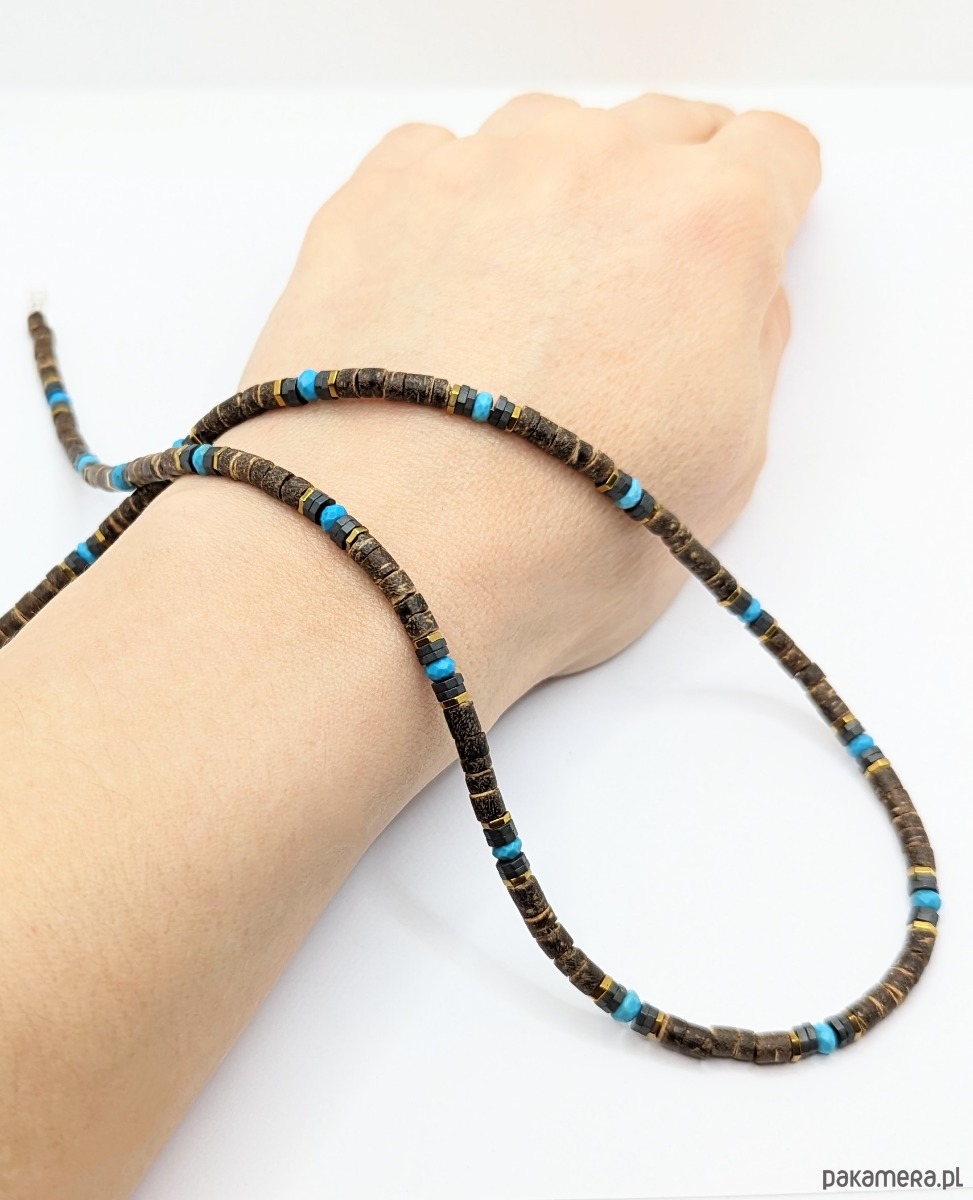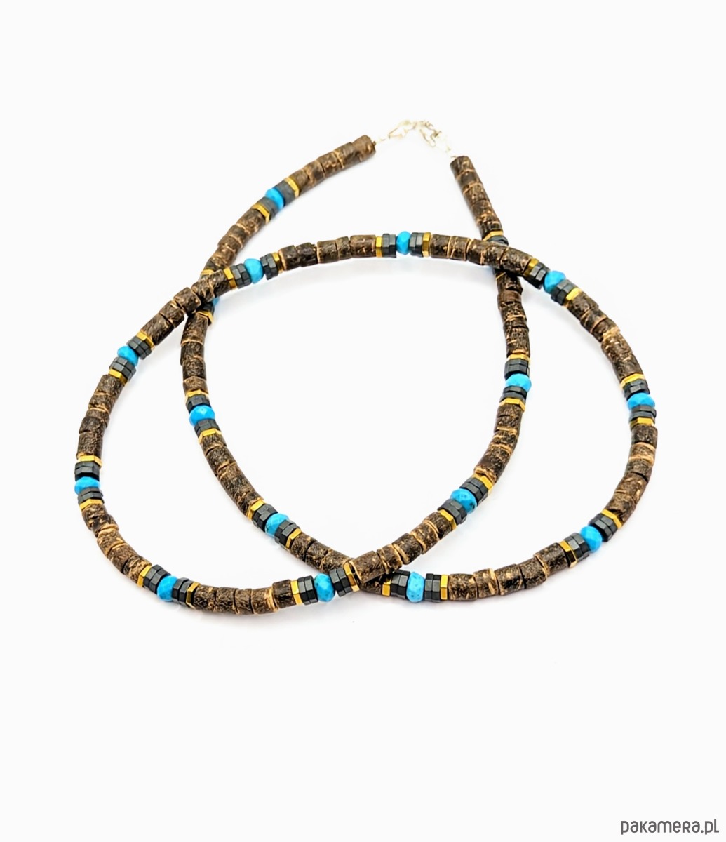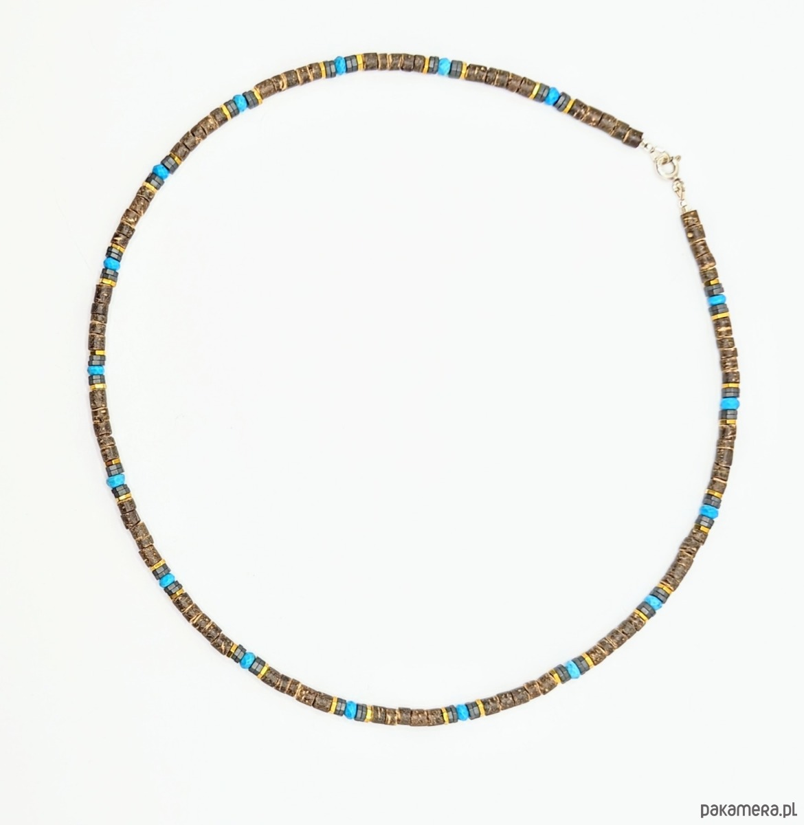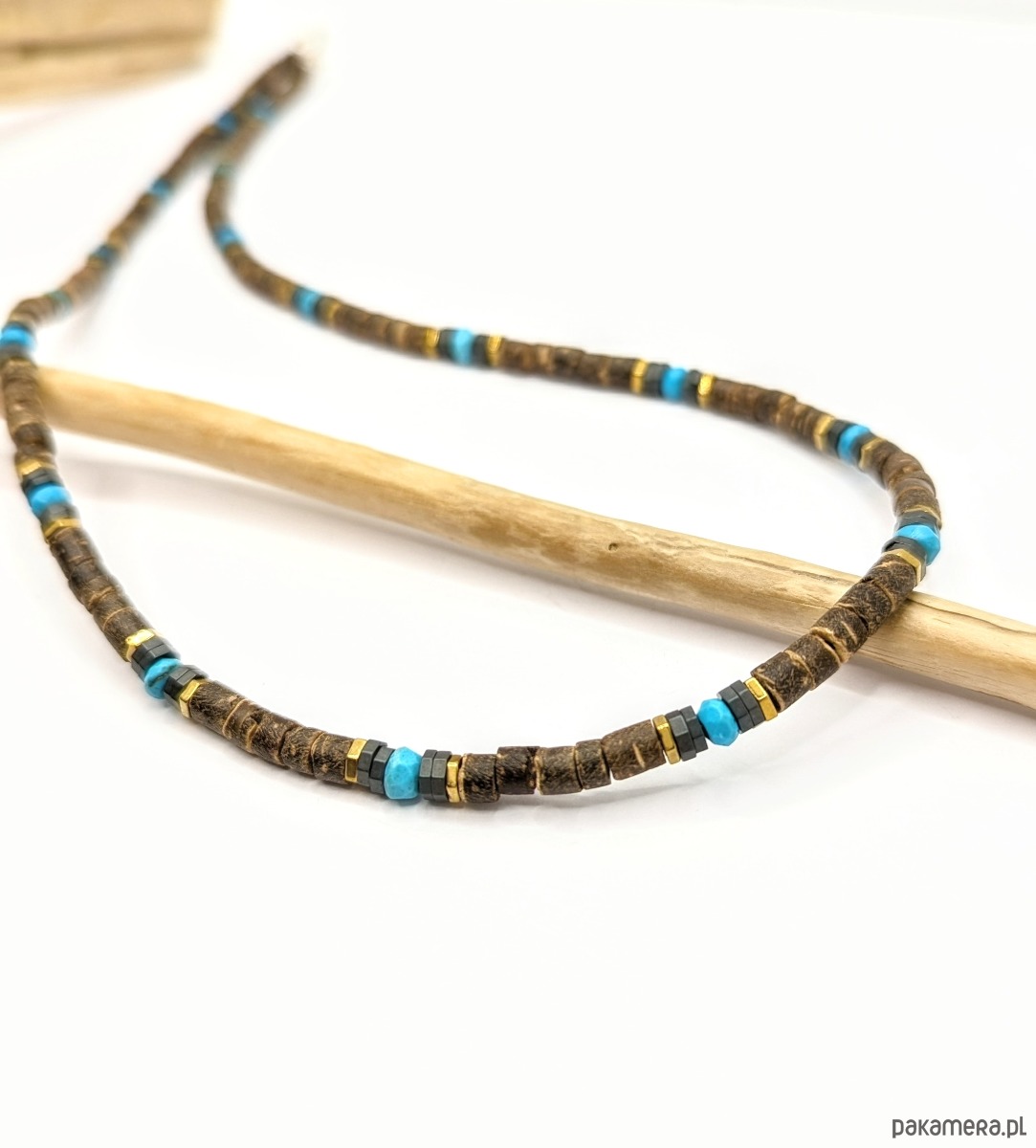 Naszyjnik męski pod szyję. Bardzo wygodny, lekki, wykonany z drewna oraz kamieni howlitu i hematytu. Naturalny i neutralny.