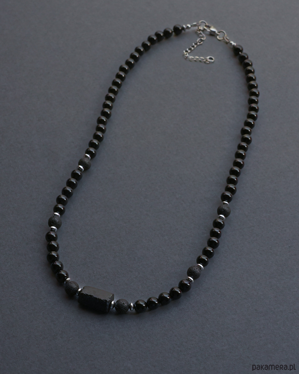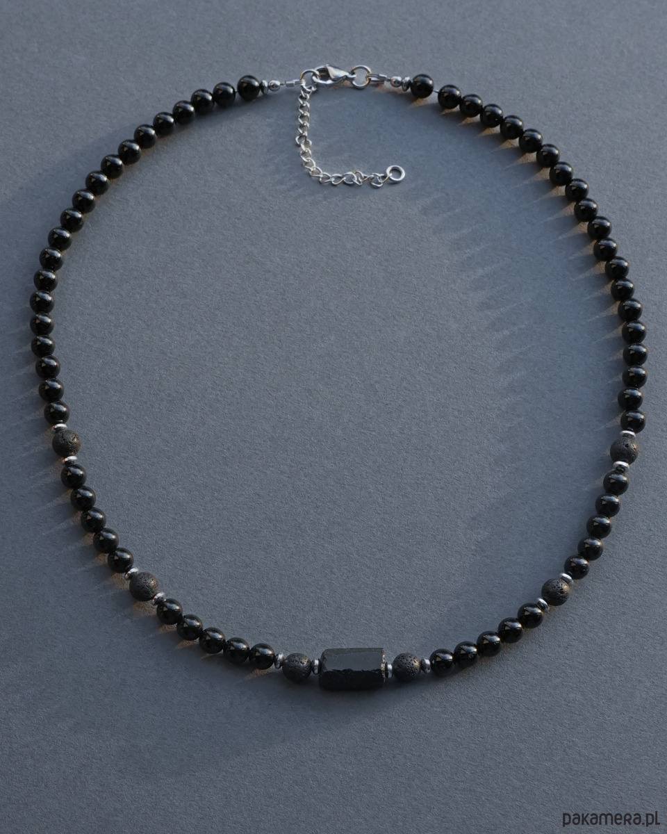Krótki, męski naszyjnik ochronny z czarnego ONYKSU, z dodatkiem surowej LAWY WULKANICZNEJ i srebrnego HEMATYTU. Centralny element stanowi czarny, surowy TURMALIN w formie ciosanej bryłki. Naszyjnik posiada klasyczne zapięcie karabińczyk oraz dodatkowy łańcuszek tzw. przedłużkę wykonane ze srebrnej STALI SZLACHETNEJ.