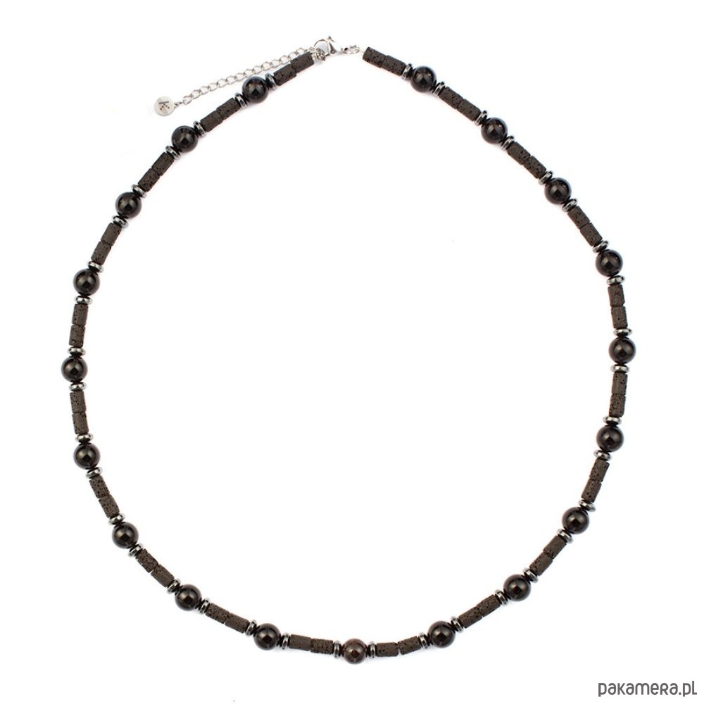 Wymiary: Kamienie: Lawa Wulkaniczna/Onyks/Granat/HematytWielkość kamieni: ok.6x5mm/8mm/8mm/ok.2x5mmDługość: ok. 55 cm + 5 cm regulacji Blaszka z logo: 6mm
