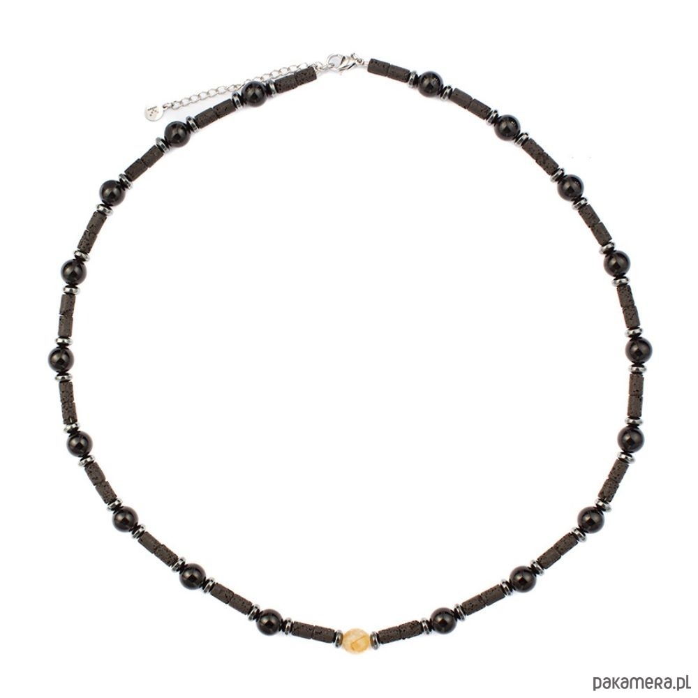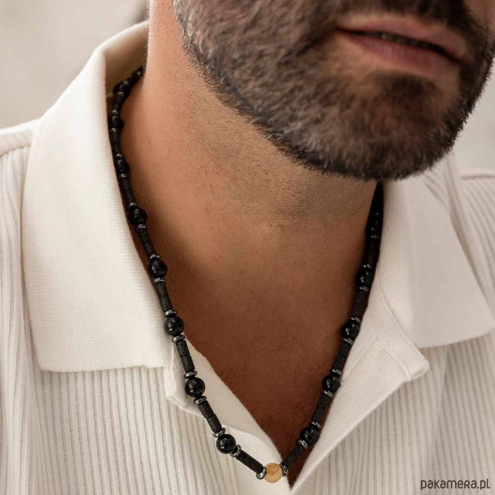 Męski naszyjnik zodiakalny dedykowany Pannie to unikalne połączenie Czarnego Turmalinu, Hematytu, Cytrynu i Lawy Wulkanicznej. Czarny Turmalin wzmacnia siłę wewnętrzną i działa jak tarcza ochronna przed negatywną energią, Hematyt stabilizuje i wspiera koncentrację, Cytryn przyciąga pomyślność i pozytywną energię, a Lawa Wulkaniczna oczyszcza i uziemia, dając poczucie równowagi.