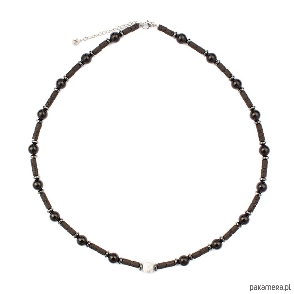 Wymiary: Kamienie: Lawa Wulkaniczna/Turmalin czarny/Howlit/HematytWielkość kamieni: ok.6x5mm/8mm/8mm/ok.2x5mm Długość: ok. 55 cm + 5 cm regulacji Blaszka z logo: 6mm