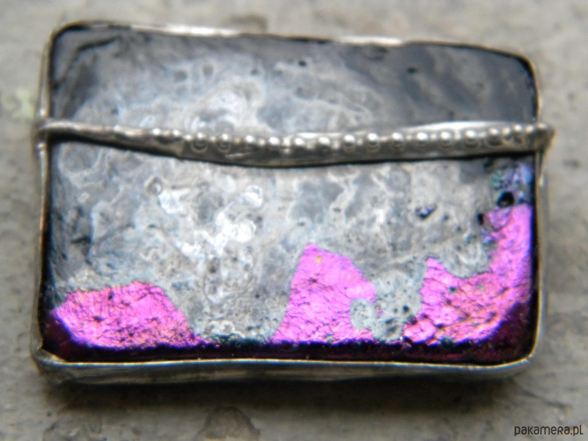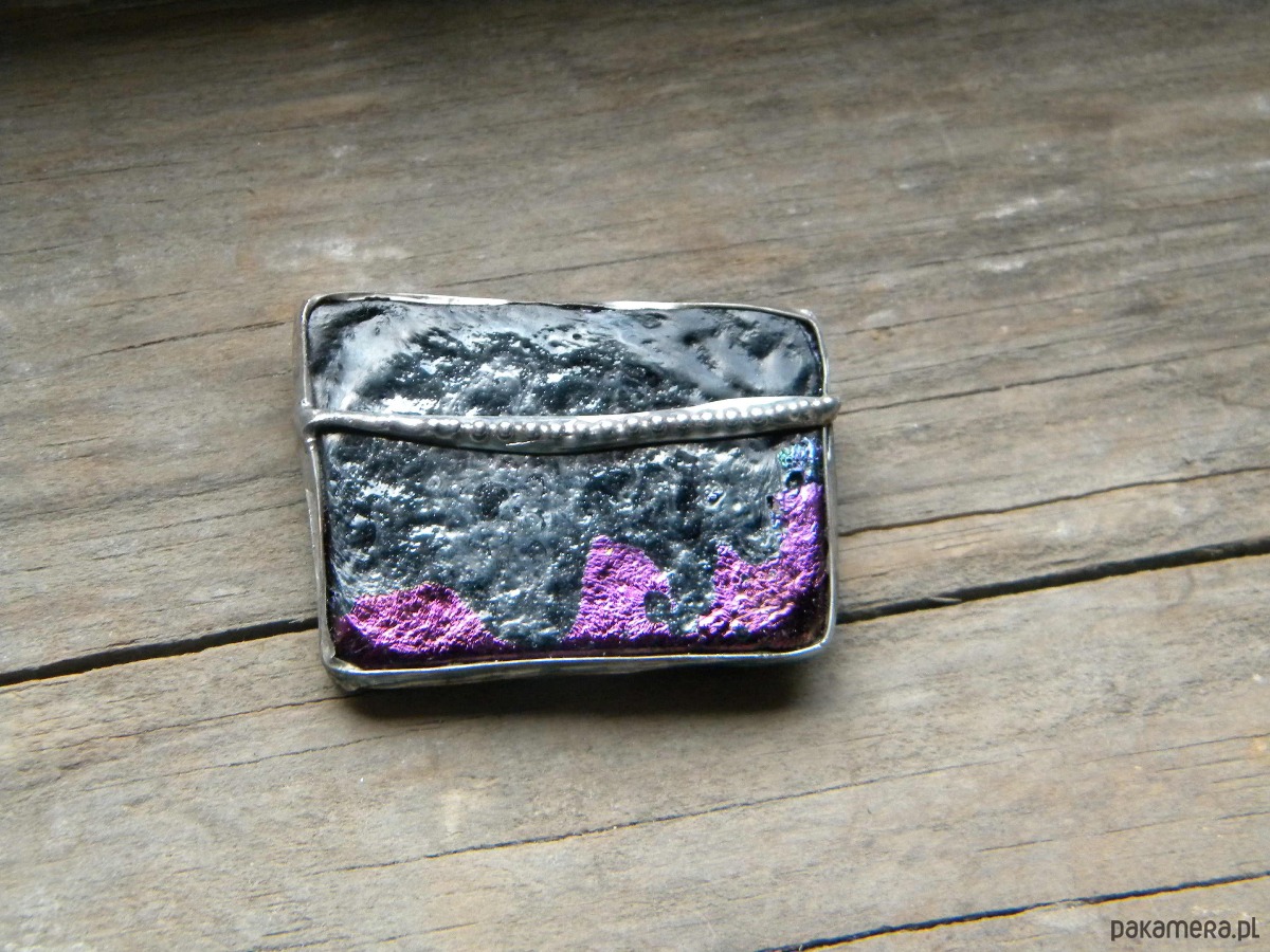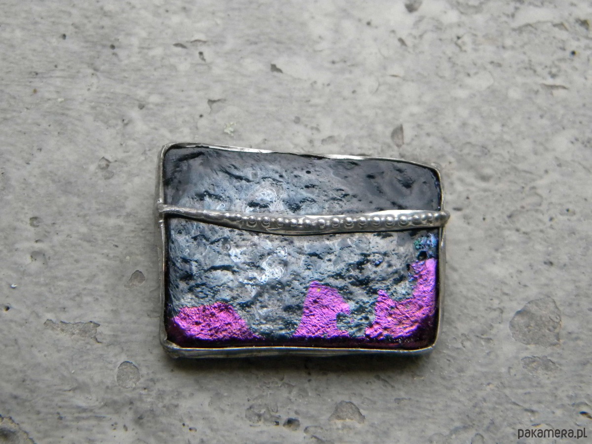 Broszka z kolekcji " powłoki - szkła eksperymentalne " Uzyskane efekty są techniką własną. powierzchnia szkła pokryta jest nieścieralną powłoką , wtopioną w szkło bazowe.