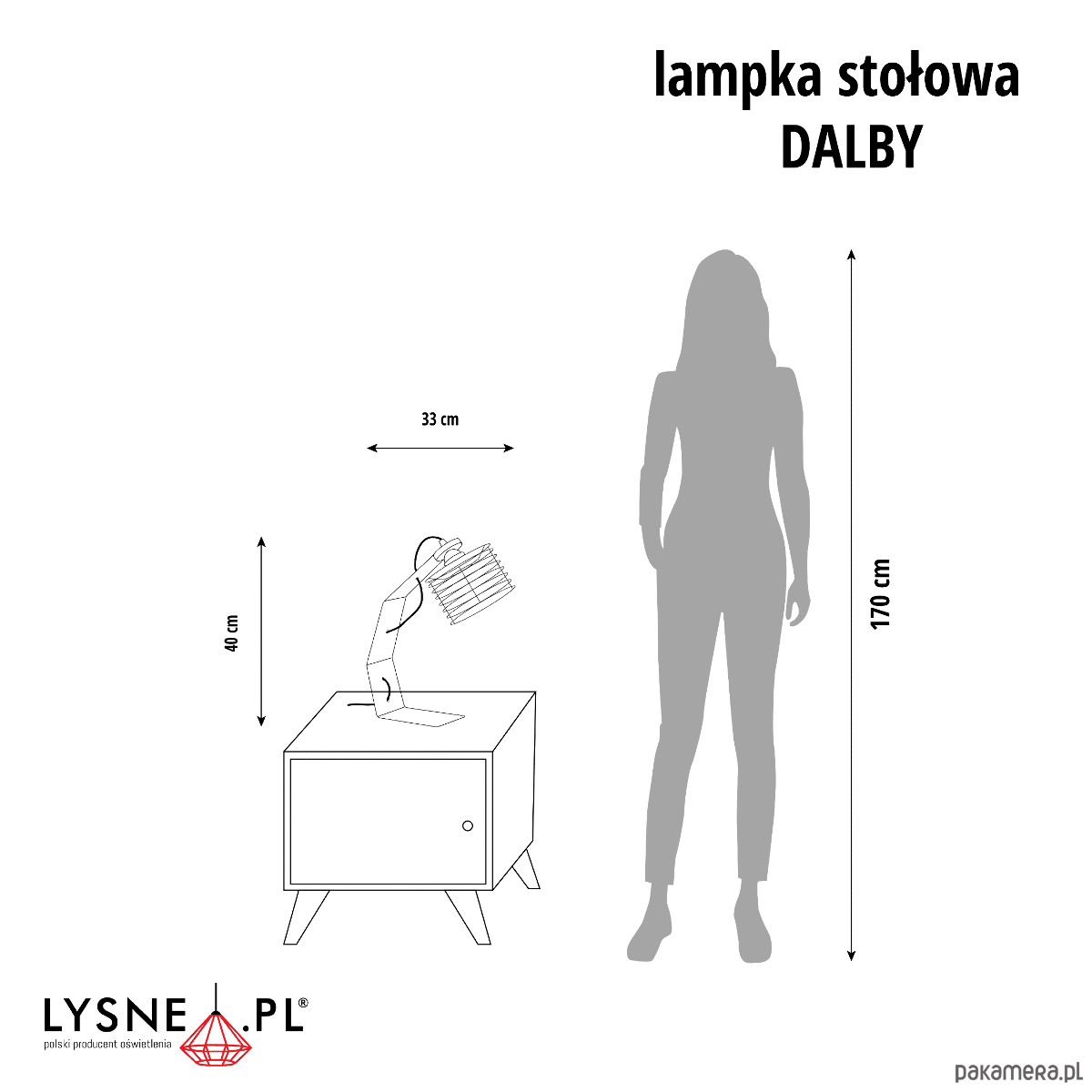 Designerską lampkę stołową DALBY wyróżnia okrągły abażur, który jest druciany oraz metalowy stelaż. W swoim kształcie przypomina łamany prostokąt ze stabilną podstawą. Elementem dekoracyjnym jest także żarówka umieszczona wewnątrz konstrukcji. Włącznik ręczny umieszczony na przewodzie zasilającym to dodatkowy atut całej oprawy. Dzięki temu ta nowość proponowana przez polskiego producenta lamp i abażurów LYSNE.PL staje się delikatniejsza i lżejsza w swojej formie. Całkowita wysokość lampki DALBY wynosi 40 cm, natomiast szerokość 33 cm. Druciany klosz oferowany jest w dwóch wariantach kolorystycznych: białym i czarnym.