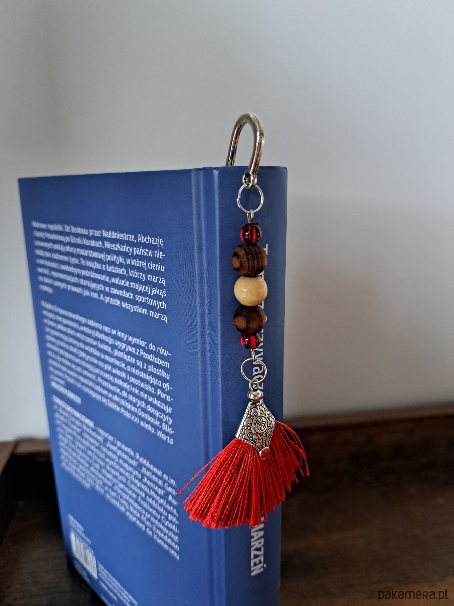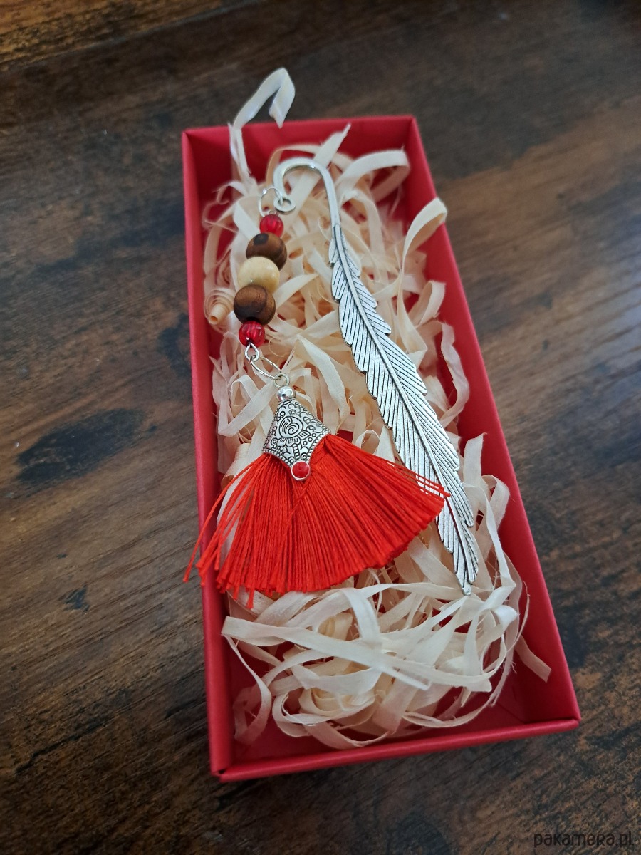 Zakładka zdobiona koralikami, zwieńczona czerwonym chwostem w okuciu.