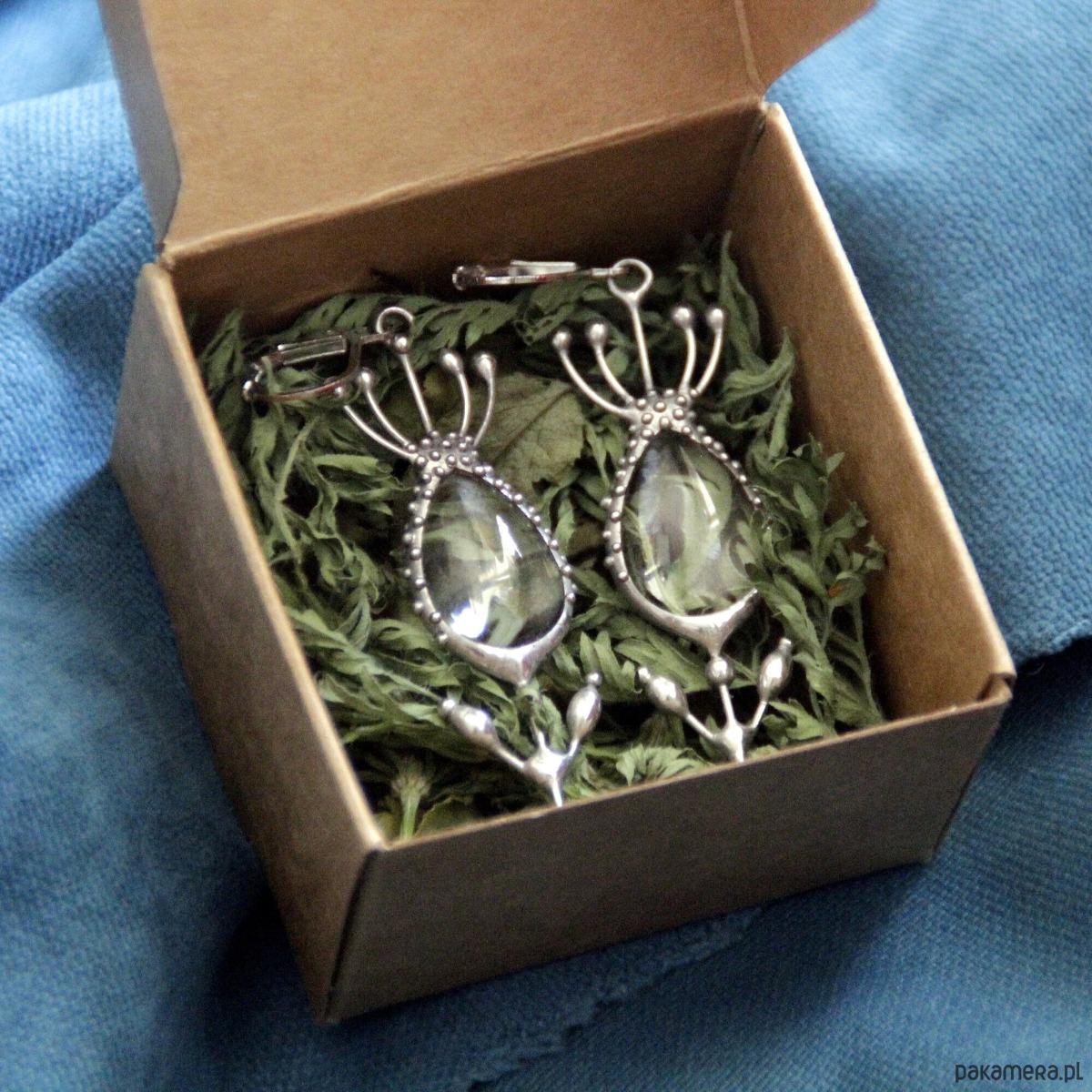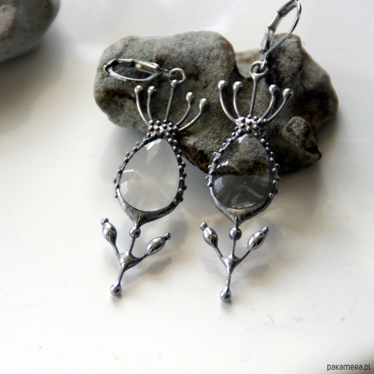 Metalowe kolczyki boho hippie z motywem kwiatów i przezroczystym szkłem