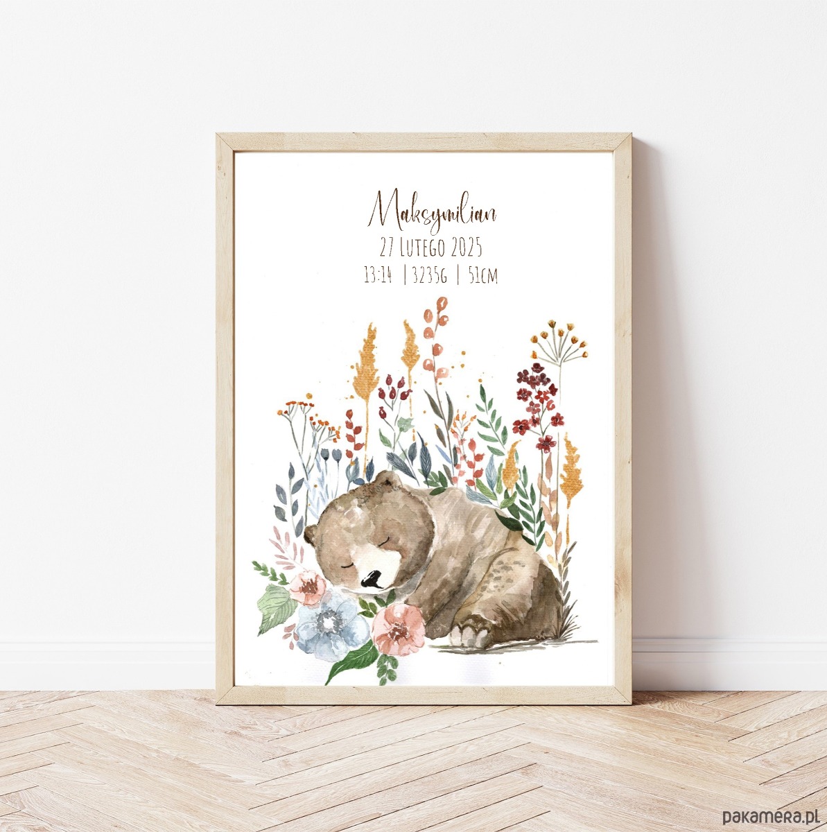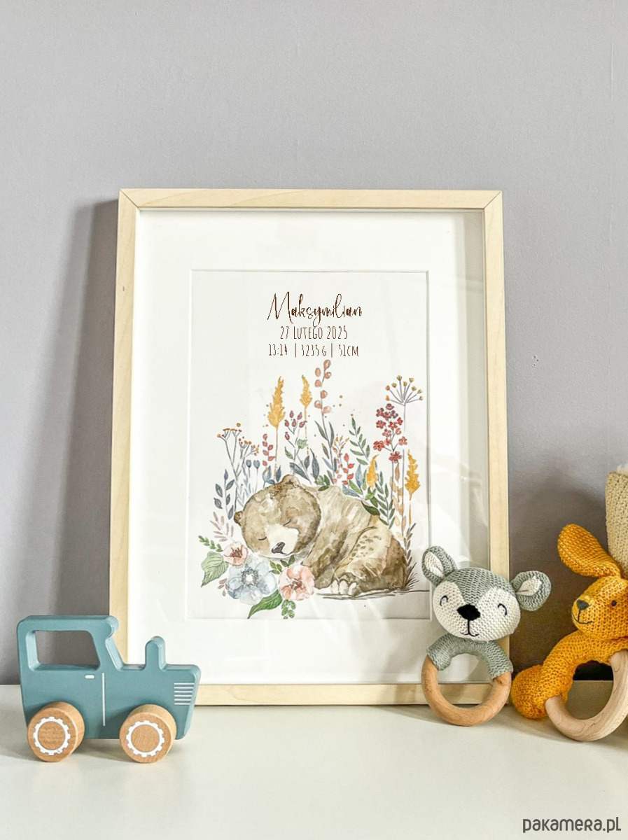 📝 Personalizowana treść – imię, data urodzenia, waga i długość zapisane odręcznym pismem.