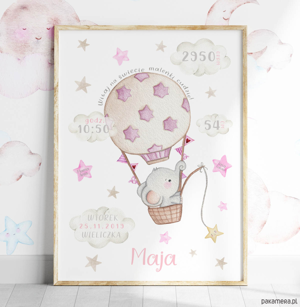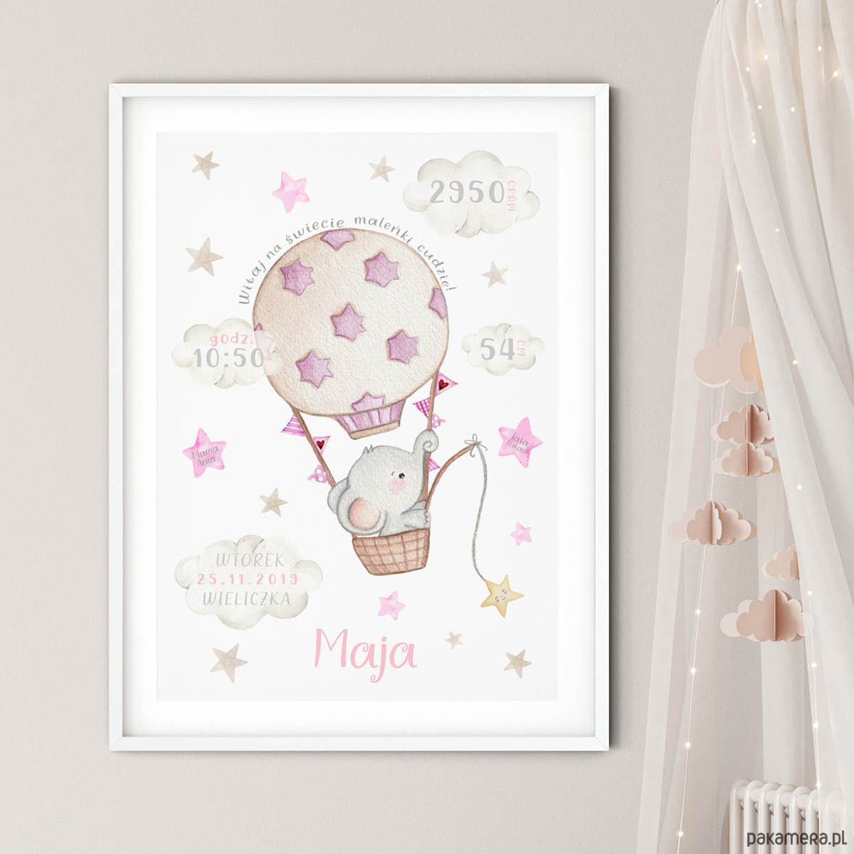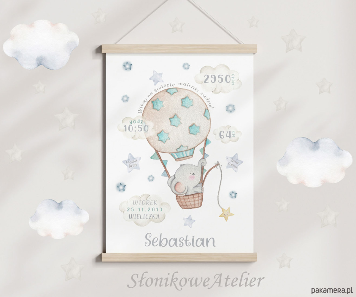 Metryczka dla dziecka Słoń w balonie Obrazek do pokoju dziecięcego