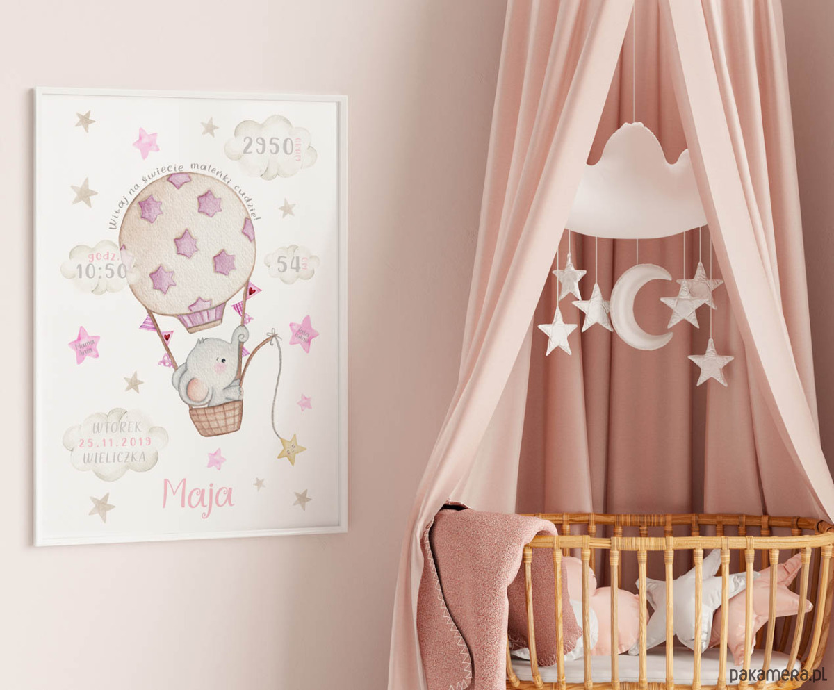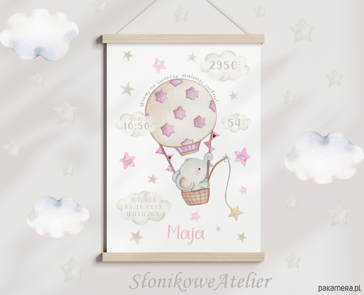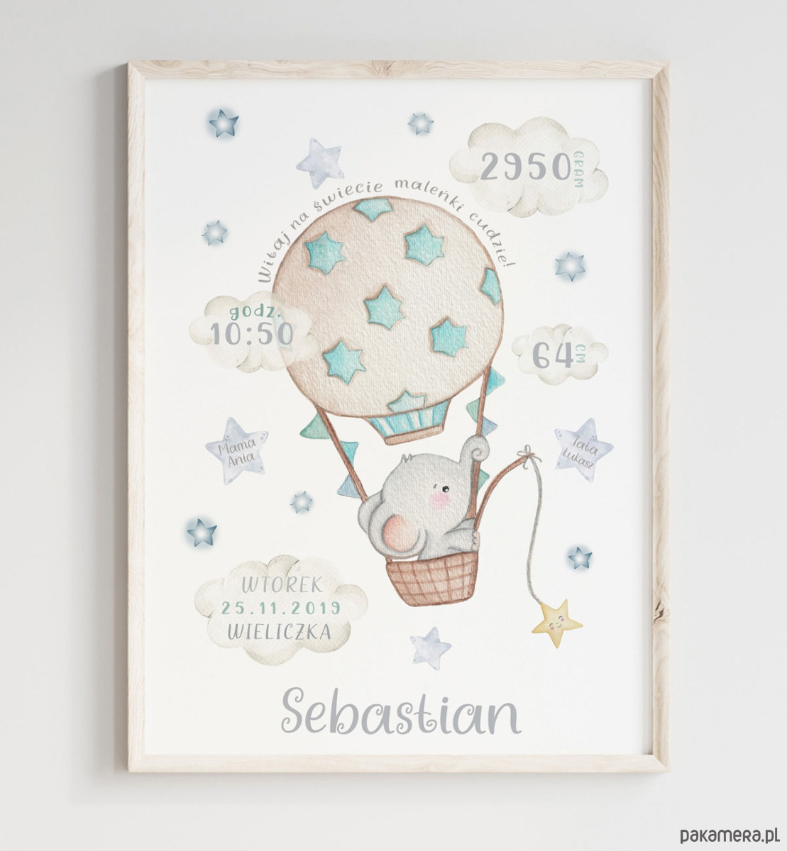 Metryczka dla dziecka Słoń w balonie Obrazek do pokoju dziecięcego
