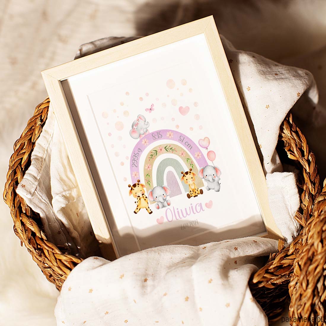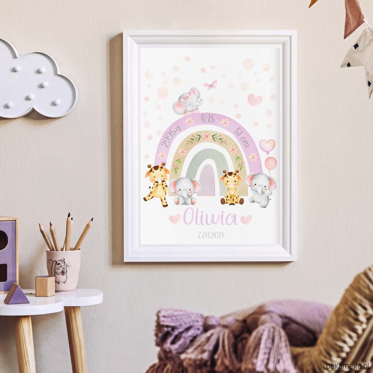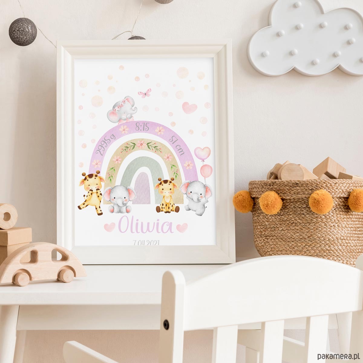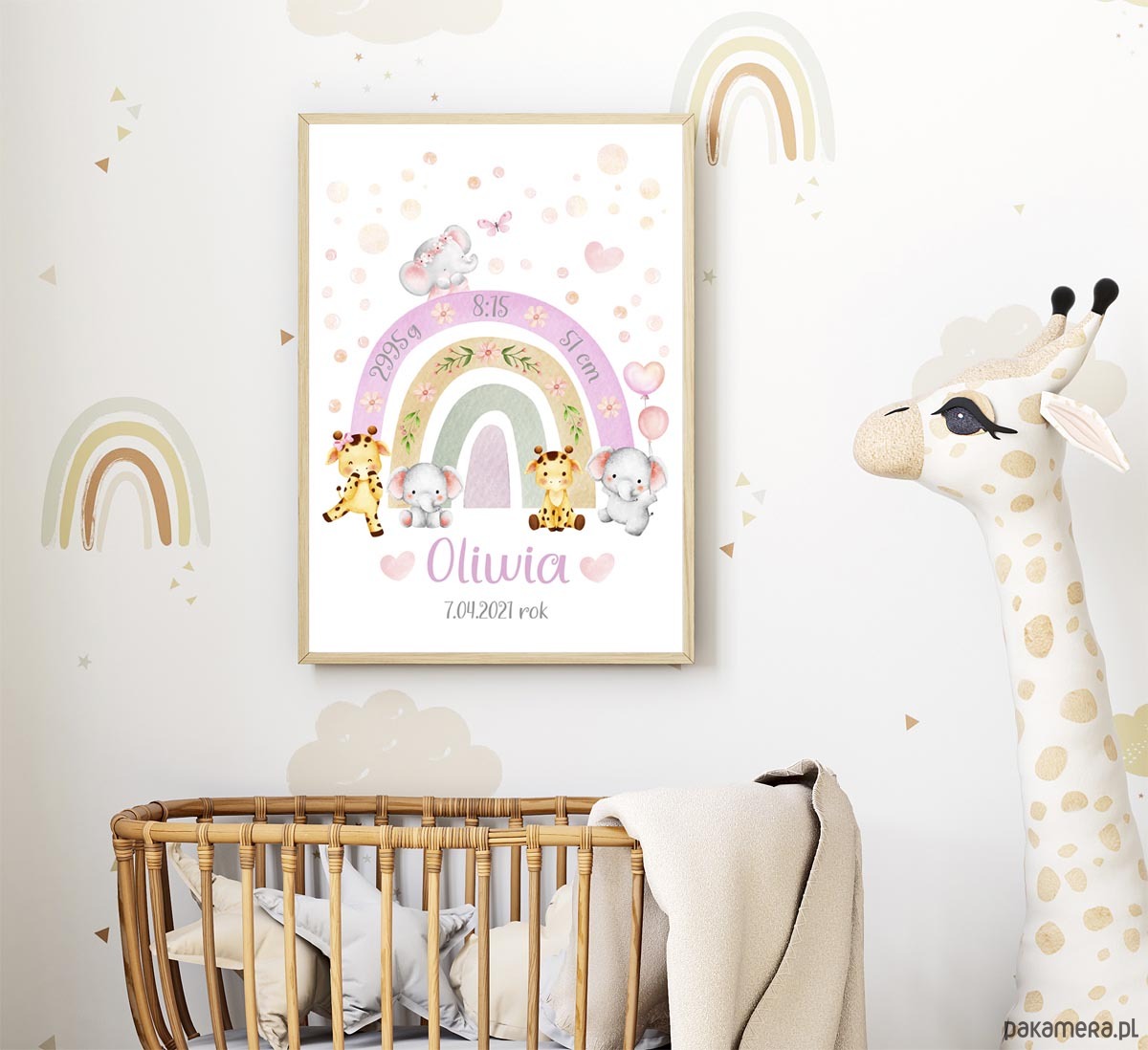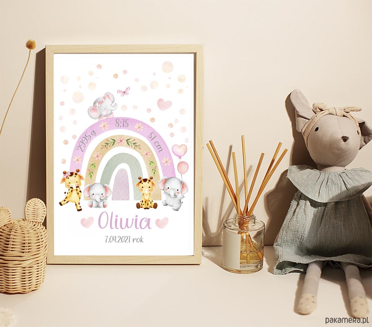 Metryczka dla dziecka Zwierzątka Słonik Żyrafa Tęcza Obrazek dla dziewczynki