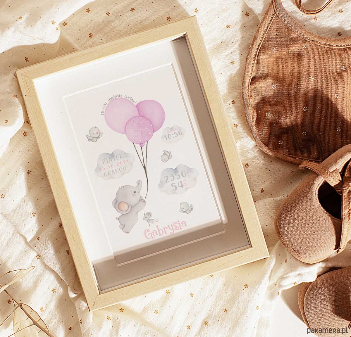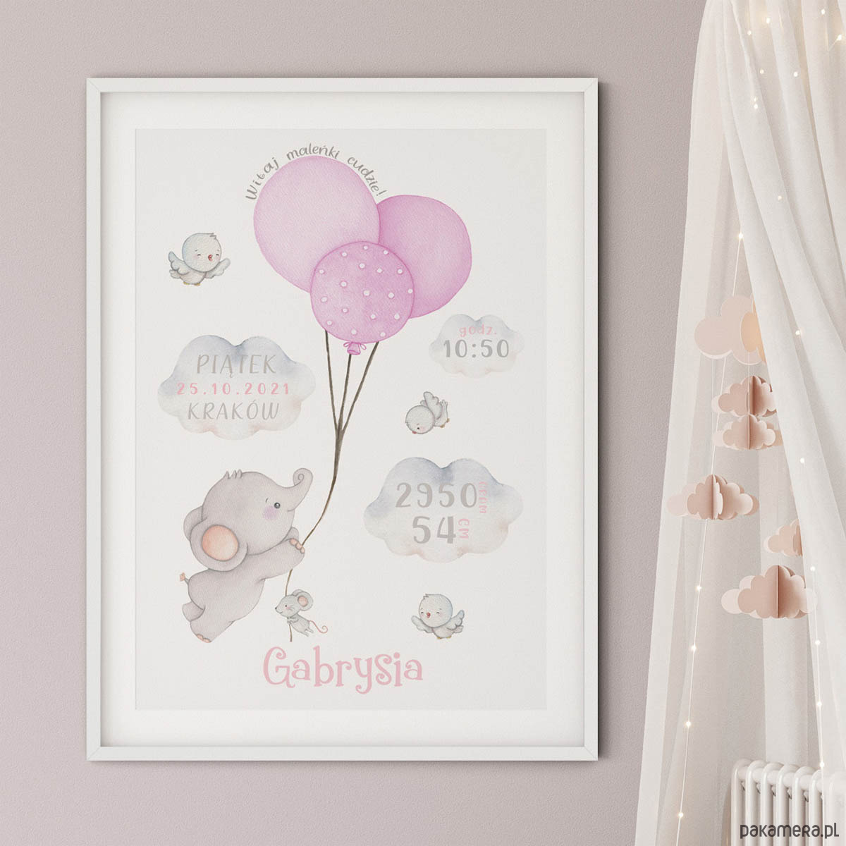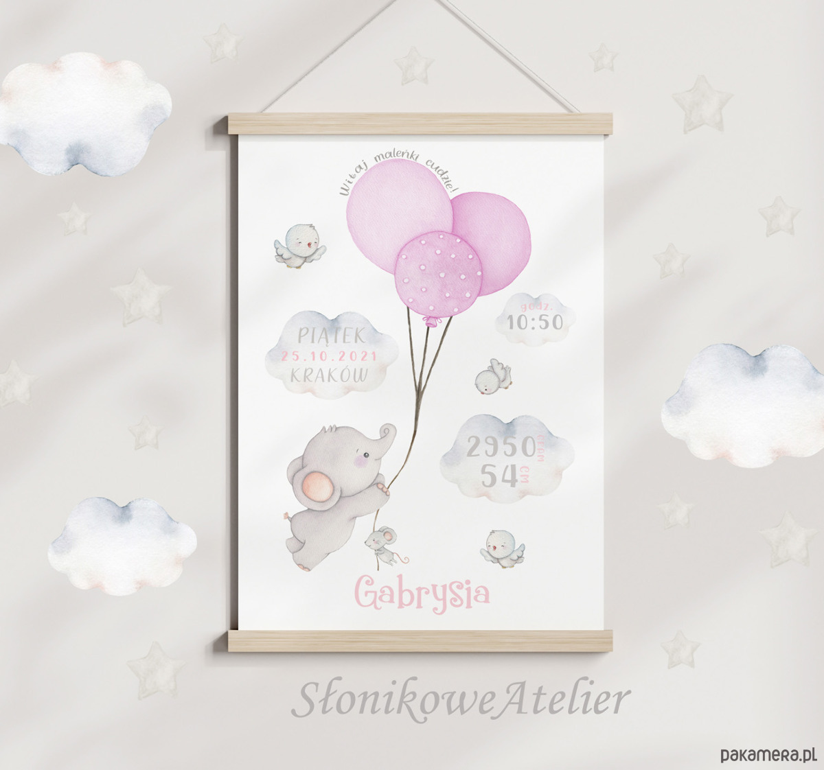 Metryczka do pokoju dziewczynki z własnoręcznie wykonaną pracą akwarelową. Obrazek prezentuje słonika lecącego na różowych balonach między chmurami. Towarzyszy mu mała myszka i trzy radosne ptaszki.