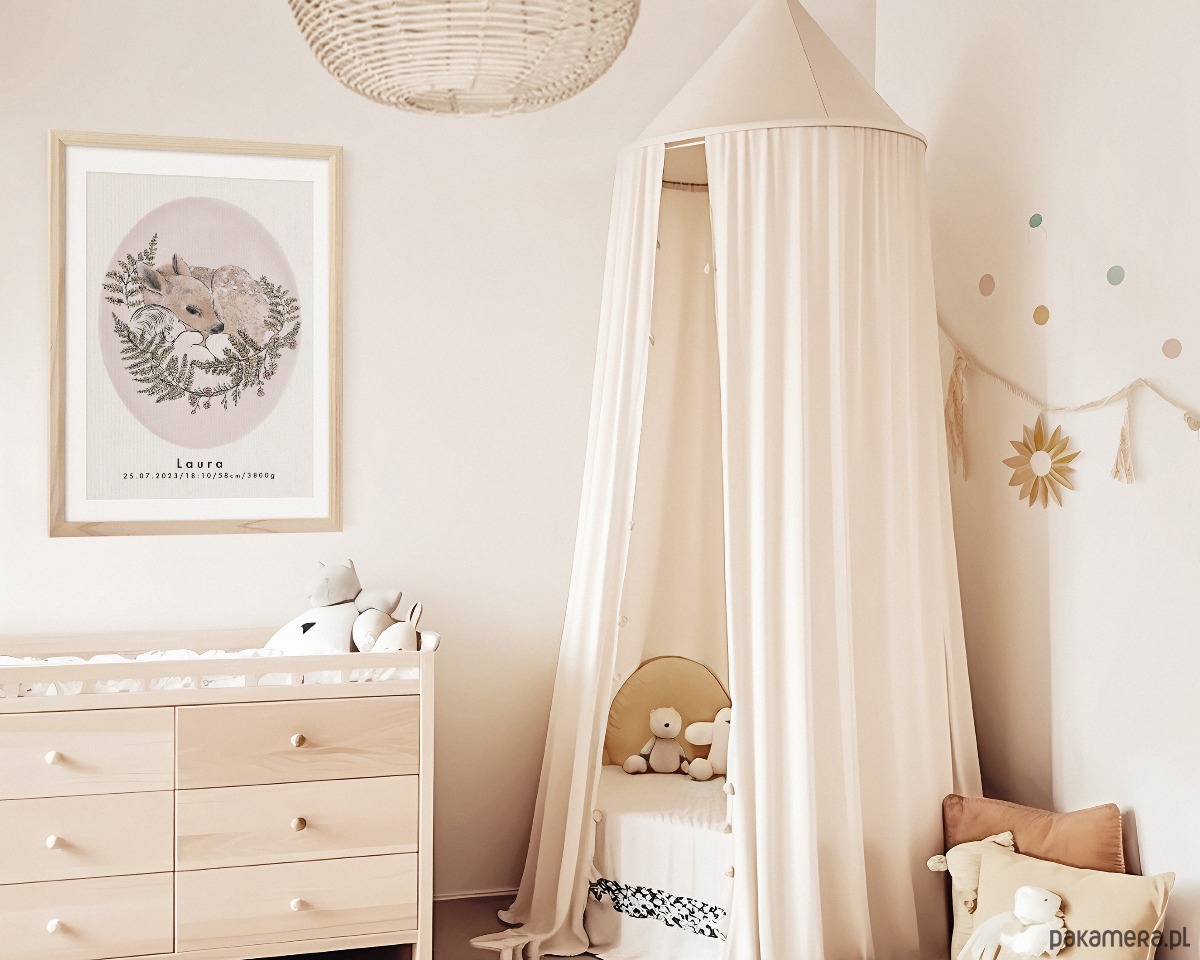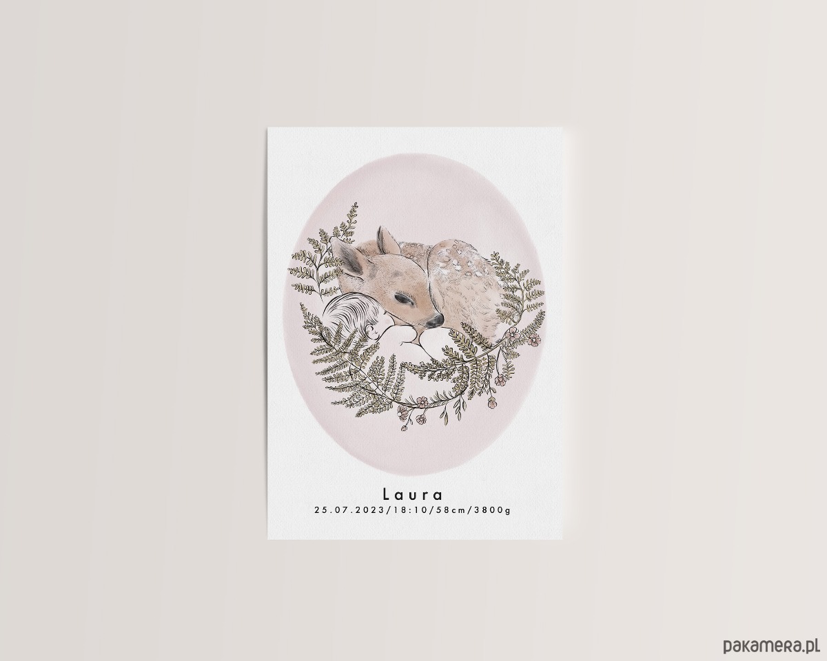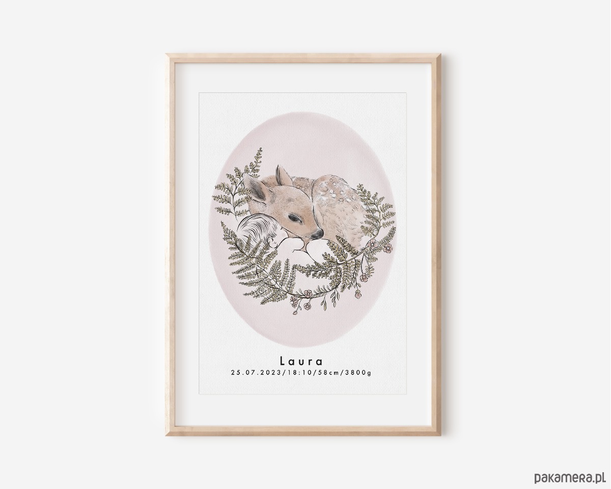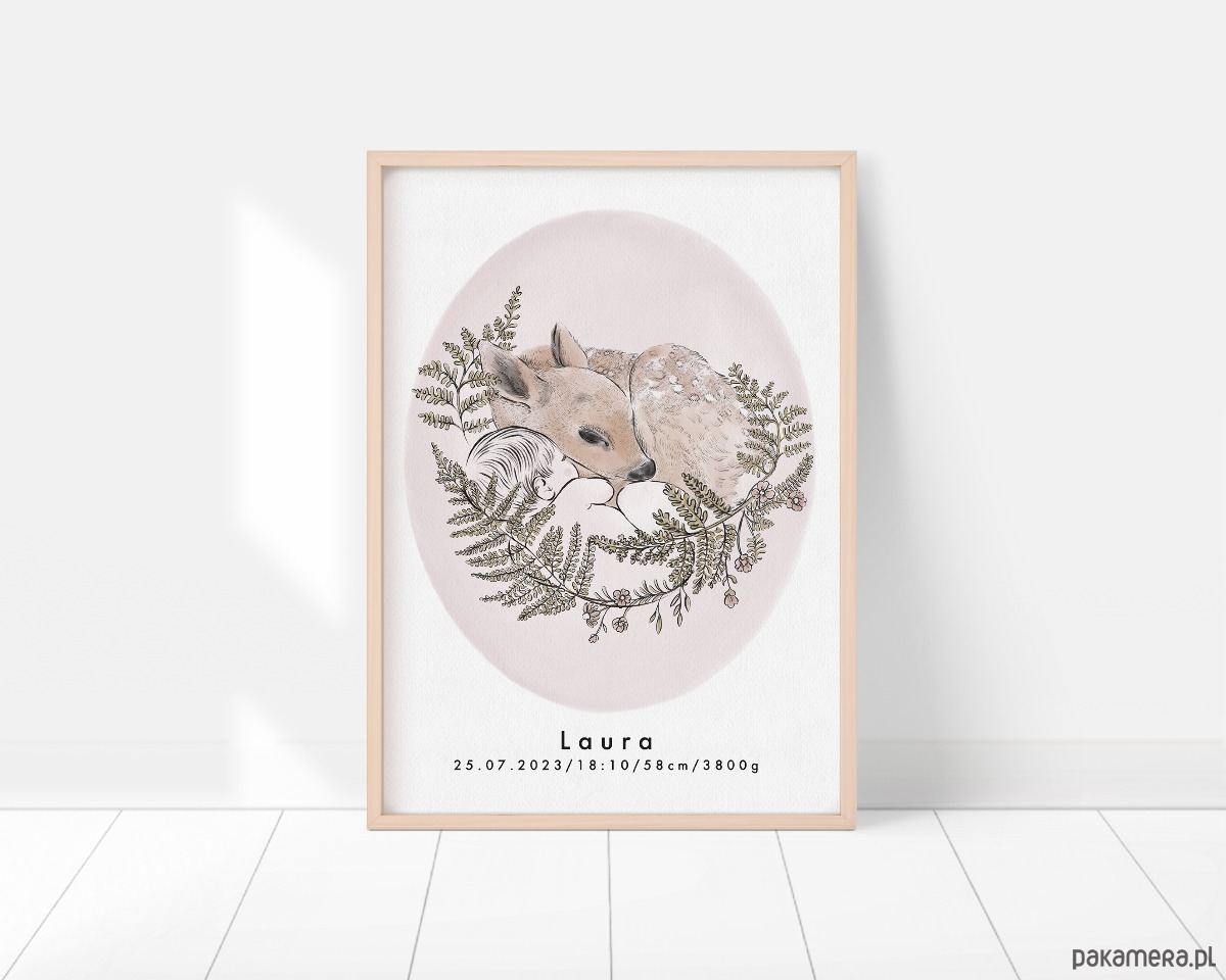 Wydruk na podstawie autorskiej ilustracji przedstawiającej śpiące niemowle z sarenką.