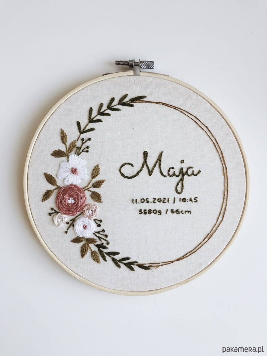 Tamborek-metryczka dla dziecka z kwiatowym haftem ręcznym.