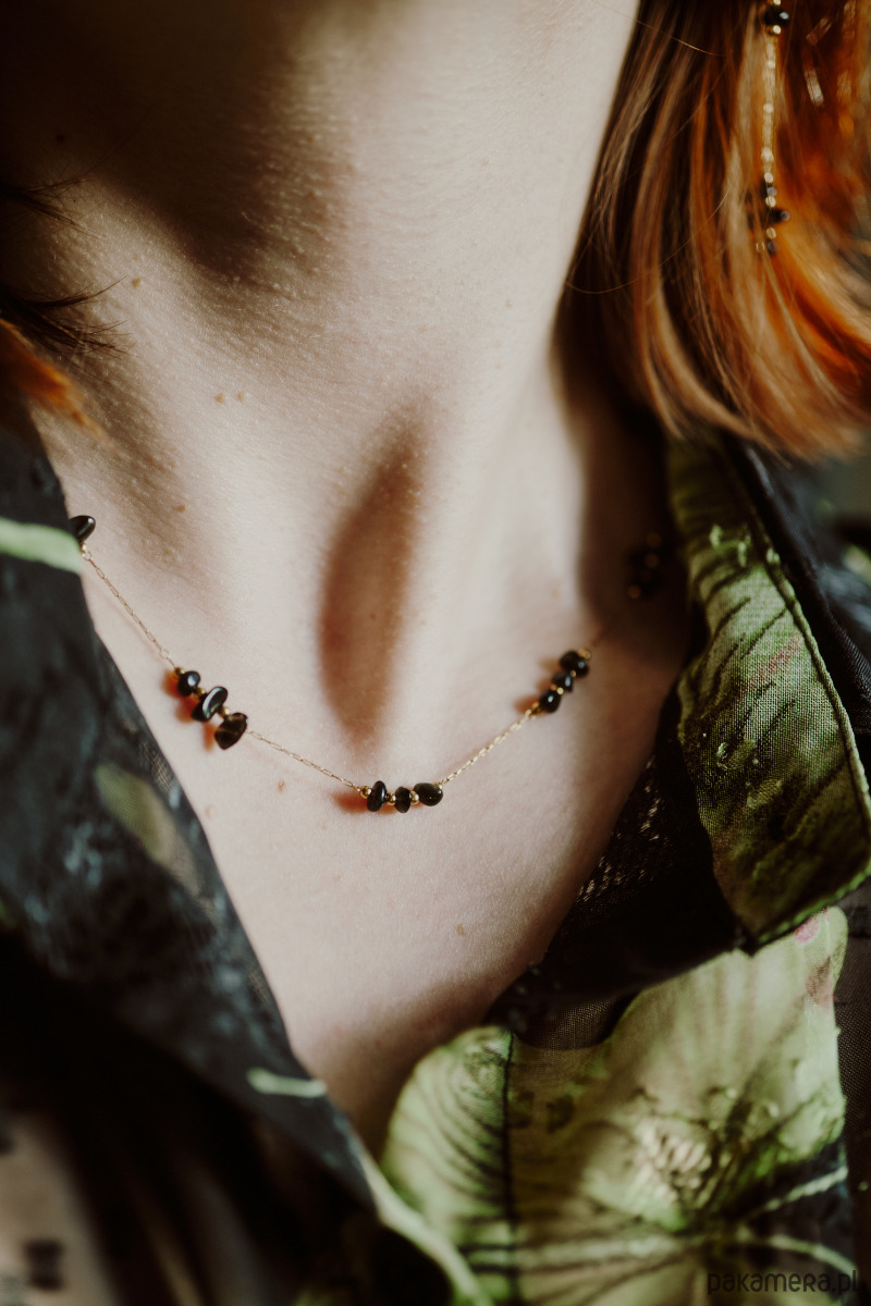 ᴍɢɪᴇᴌᴋᴀ to bardzo delikatny naszyjnik. Na drobniutki łańcuszek nawleczone są nieregularne bryłki kwarcu dymnego. Przepięknie podkreśla obojczyki i szyję. Polecany do bardziej eleganckich stylizacji. To bardzo klasyczny wzór, dlatego często wybierany jest na prezent.