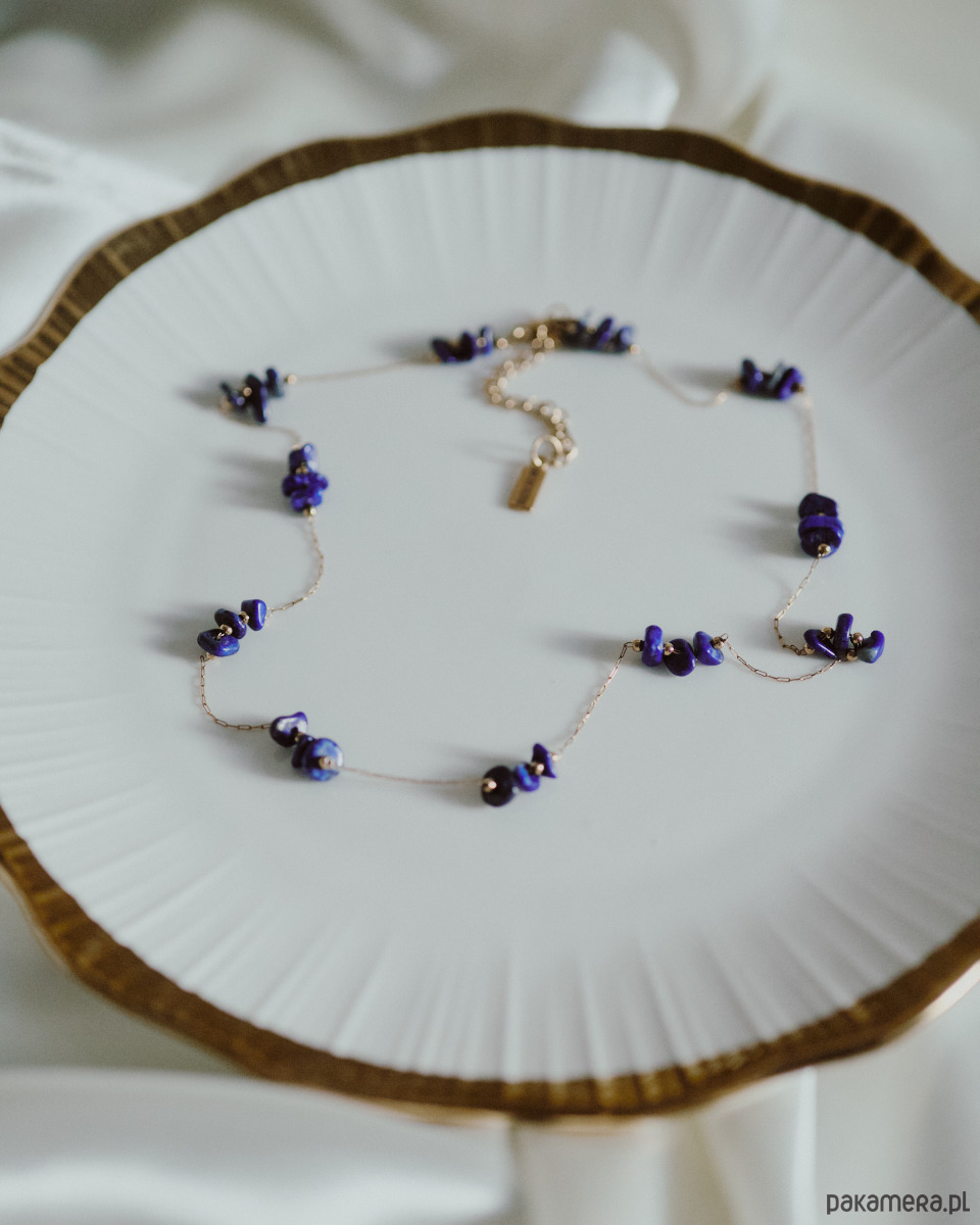 ᴍɢɪᴇᴌᴋᴀ to bardzo delikatny naszyjnik. Na drobniutki łańcuszek nawleczone są nieregularne bryłki lapis lazuli. Przepięknie podkreśla obojczyki i szyję. Polecany do bardziej eleganckich stylizacji. To bardzo klasyczny wzór, dlatego często wybierany jest na prezent.