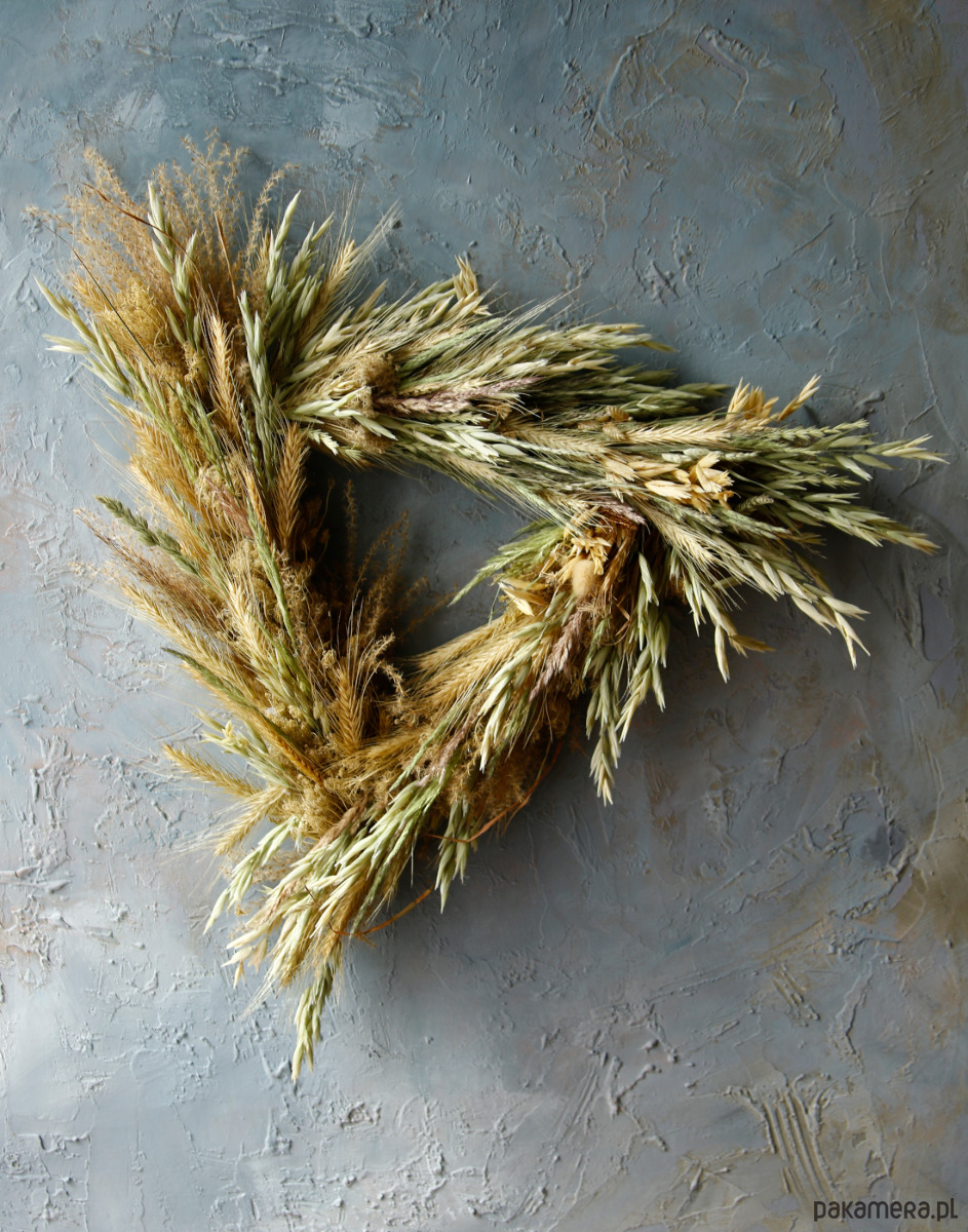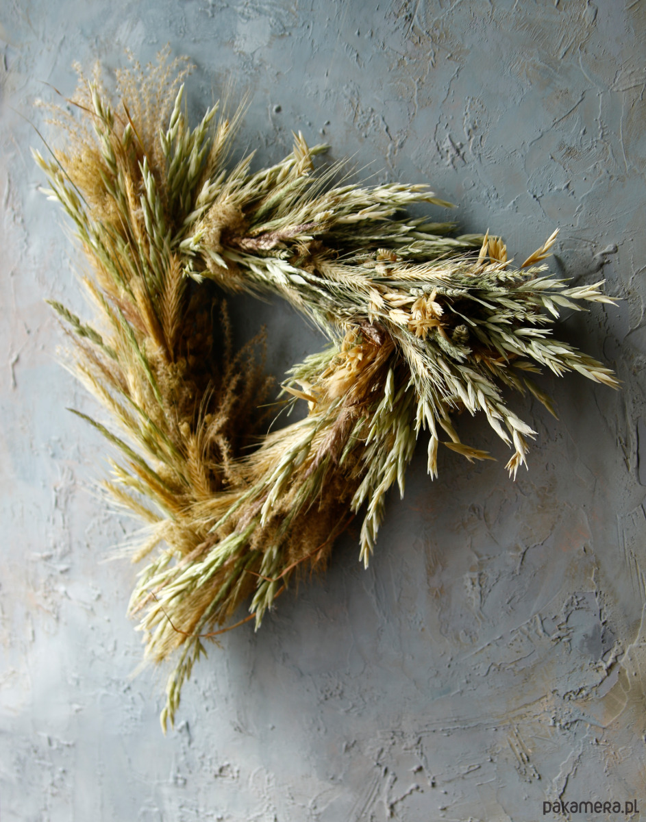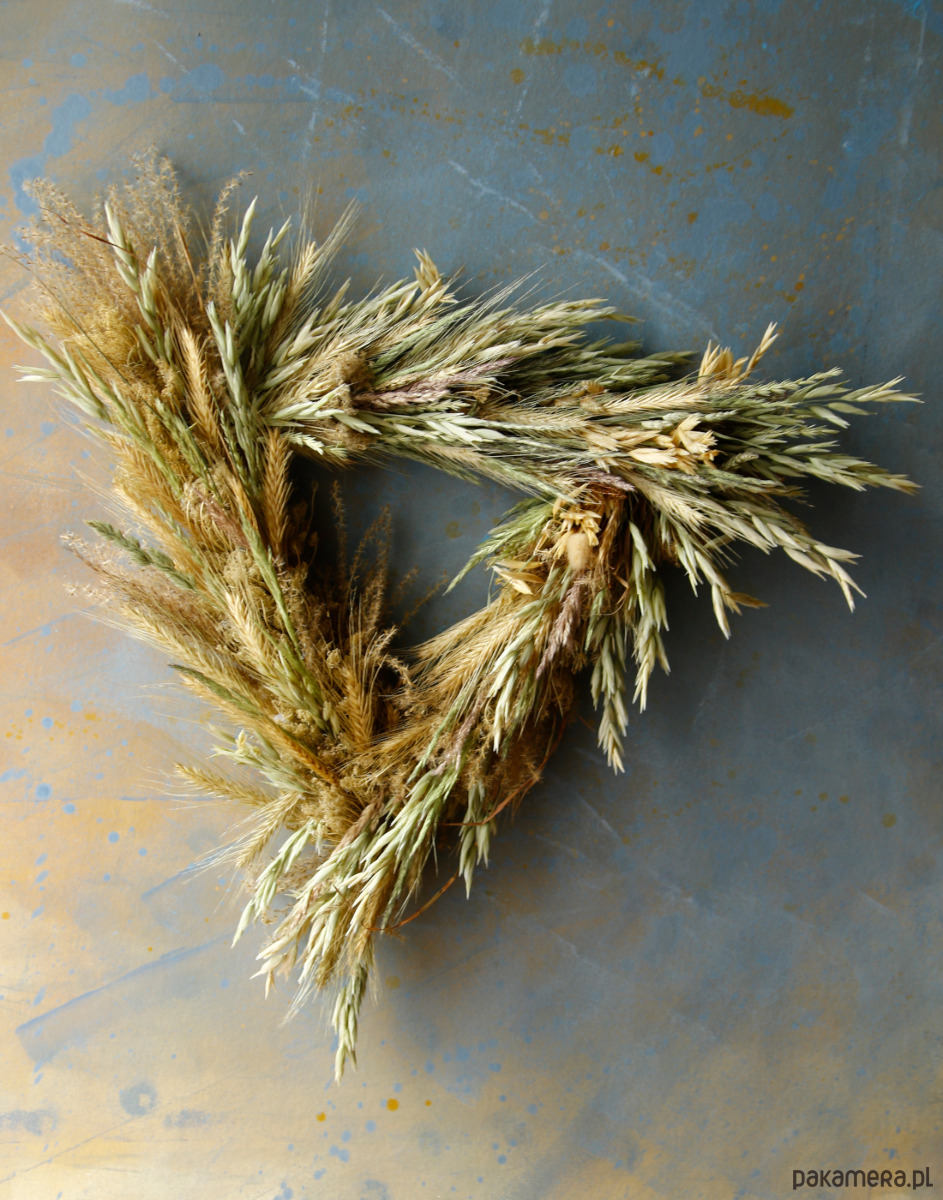 ,,Mgławica Trójlistna Koniczyna" to naturalna dekoracja o oryginalnym trójkątnym kształcie. Do zawieszenia na ścianę, zrobiona z suszonych traw i zboża.