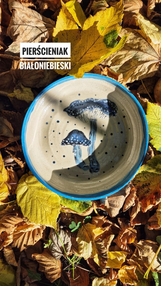 Talerz głeboki, rant 5 cm, na owsiankę, owoce, sałatkę, albo grzyby :) ilustrowany ręcznie. Średnica 25 cm. Ilustracja grzyba, muchomor niebieski, zielone grzyby niejadalne.