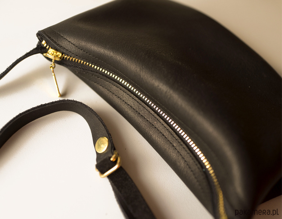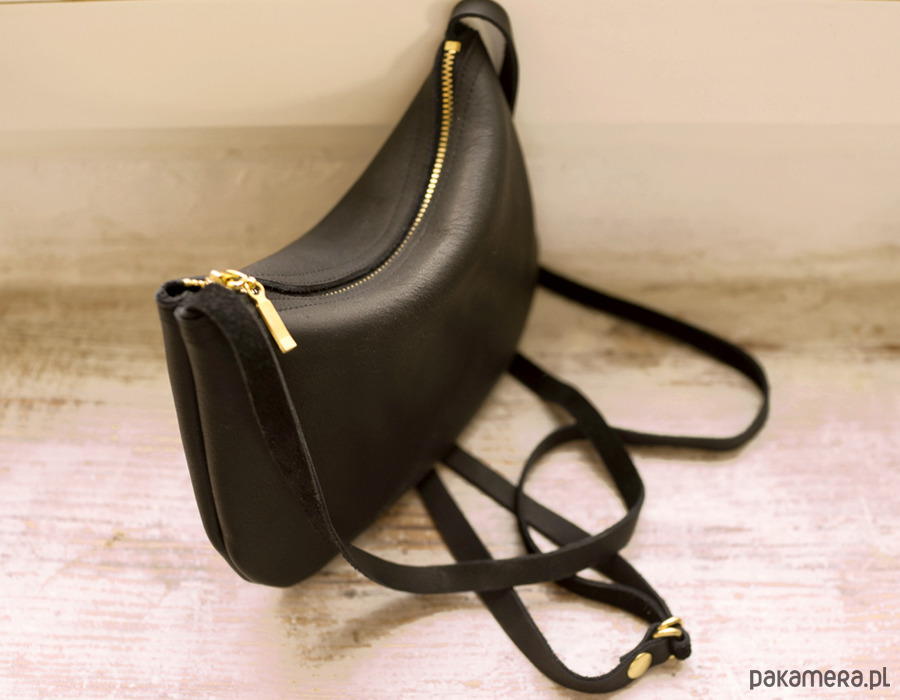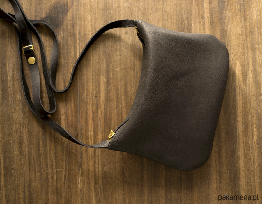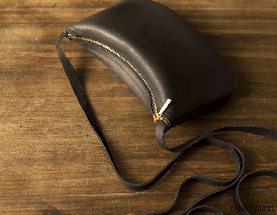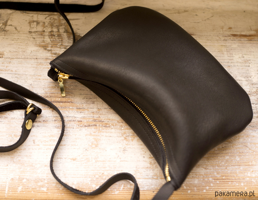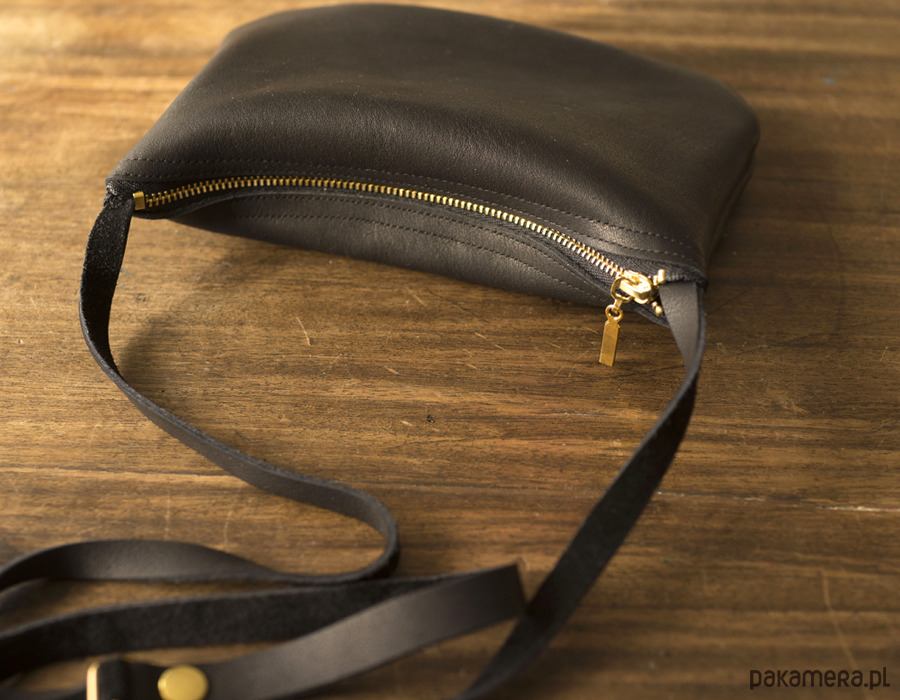 Mała zgrabna minimalistyczna torebka na ramię. Wykonana z wysoko-gatunkowej czarnej skóry, matowej olejowanej. Torebka zamykana na złoty zamek. Bez podszewki. Pasek regulowany do długości 135cm (może być więcej na życzenie). Wymiary torebki: wys.14 cm, szer 19 cm