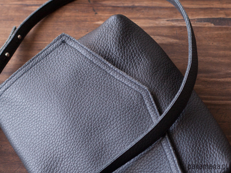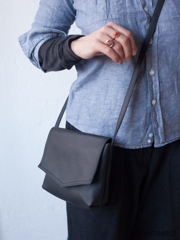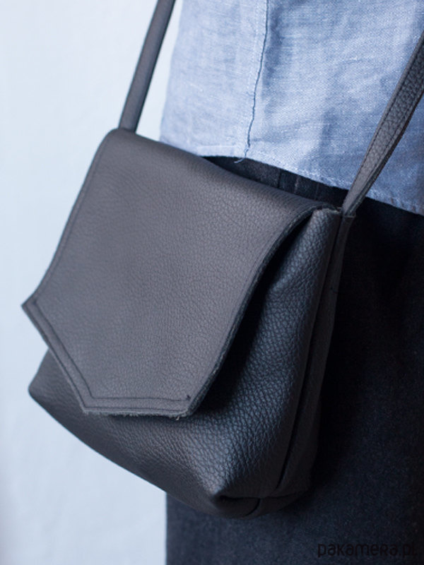 Mała minimalistyczna torebka na ramię. Wykonana z czarnej mięsistej skóry. Bez podszewki, środek to lewa strona skóry, zamszowa. Torebka może posiadać zapięcie na magnes- wg życzenia.