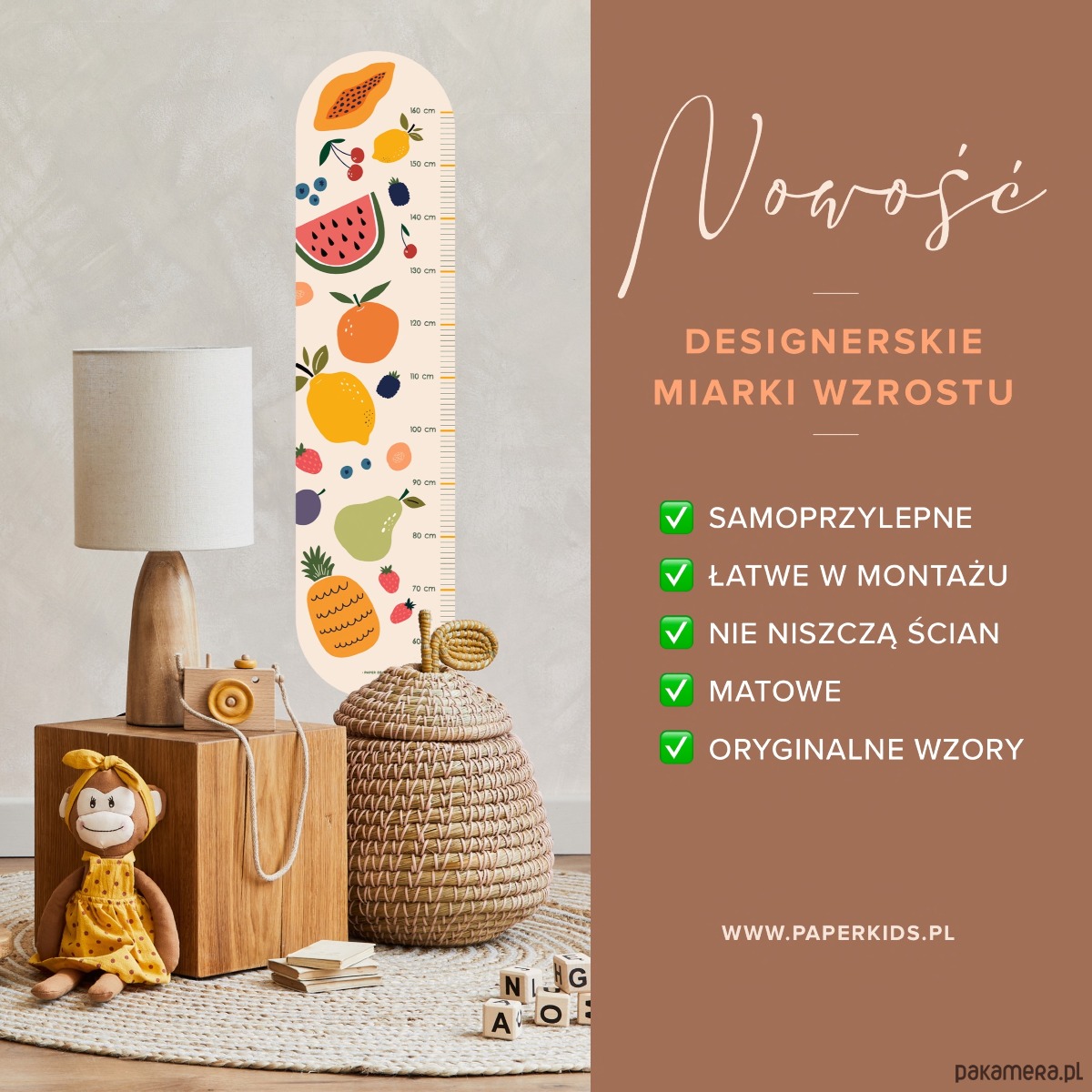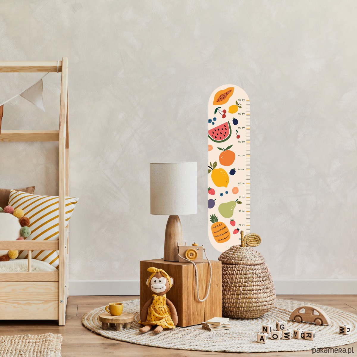Miarka posiada podziałkę zaczynającą się od 60 cm aż do 160 cm wzrostu dziecka. Należy przykleić ją niecałe 60 cm nad podłogą.