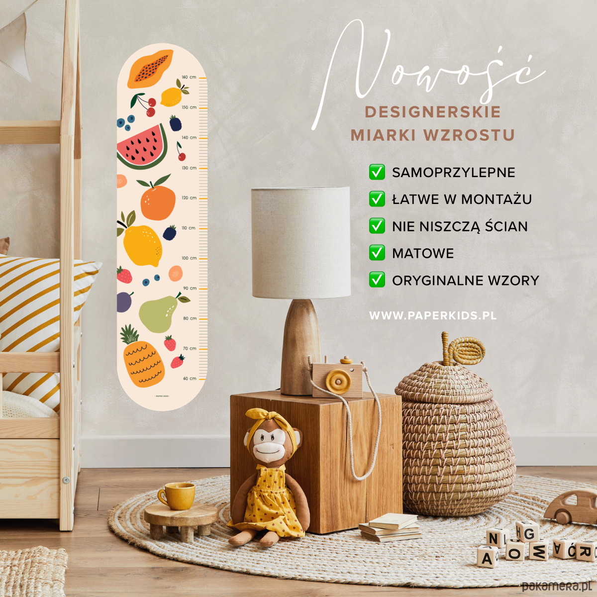 Designerska MIARKA WZROSTU dla dzieci to stylowa dekoracja dziecięcego pokoju oraz praktyczne narzędzie do pomiaru wzrostu Twojej pociechy. Idealny pomysł na prezent!