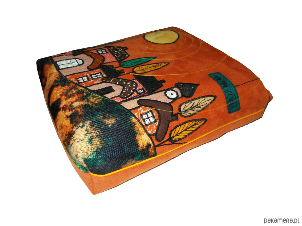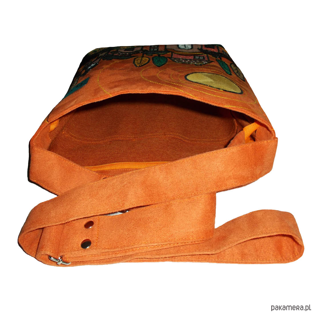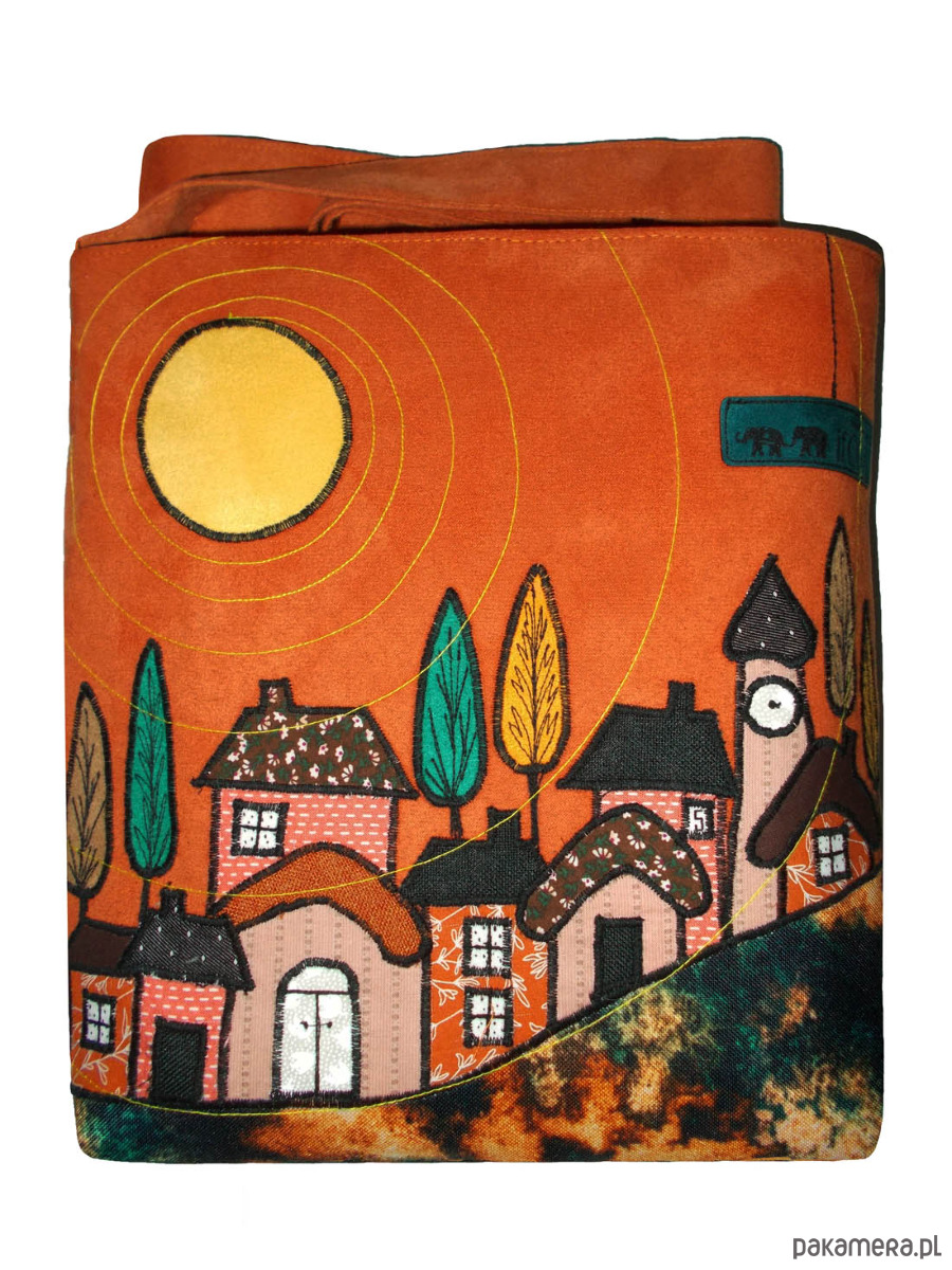 Autorska torba z eko zamszu. Pasek z regulacją, wzmocniony nitami, okucia srebrne. Przód zdobią aplikacje układające się w urokliwe miasteczko. Cała torba trzyma kształt. W szwach wypustka. Denko poszerzone. Całość zapinana na zamek. Jedna z wewnętrznych kieszeni jest również zapinana na zamek. Druga kieszeń pomieści telefon, długopis i notesik. szerokość 32cm, wysokość 30cm plus denko 8cm