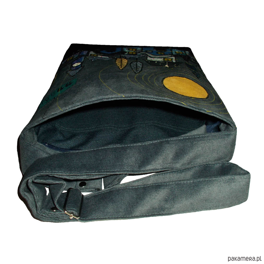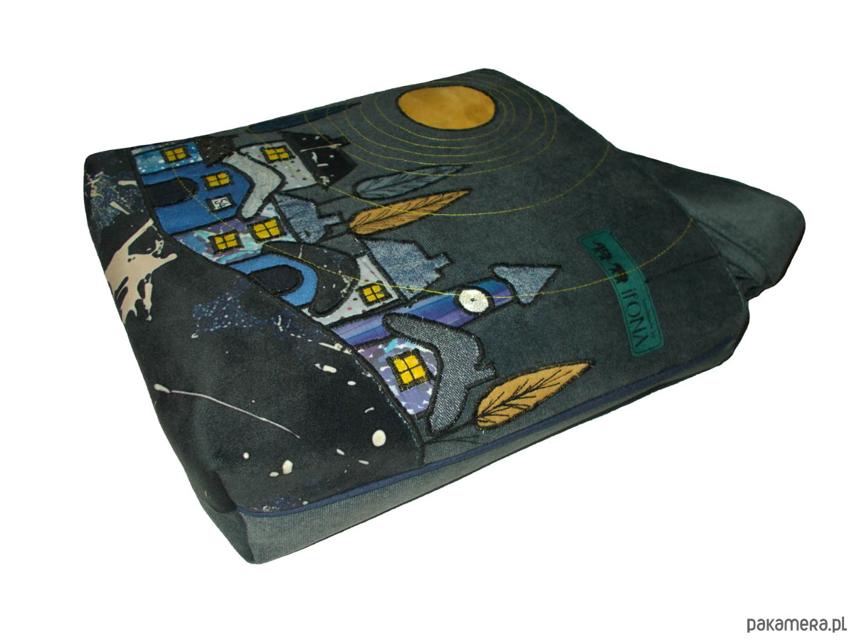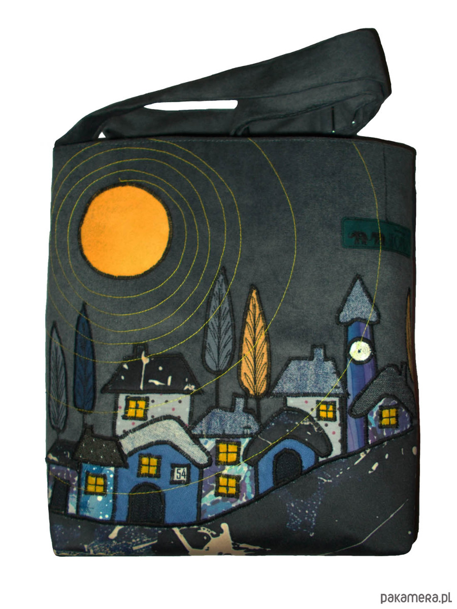 Autorska torba z tkaniny obiciowej. Pasek z regulacją, wzmocniony nitami, okucia srebrne. Przód zdobią aplikacje układające się w urokliwe miasteczko. Cała torba trzyma kształt. W szwach wypustka. Denko poszerzone. Całość zapinana na zamek. Jedna z wewnętrznych kieszeni jest również zapinana na zamek. Druga kieszeń pomieści telefon, długopis i notesik. szerokość 32cm, wysokość 30cm plus denko 8cm