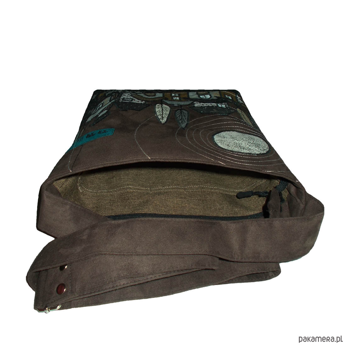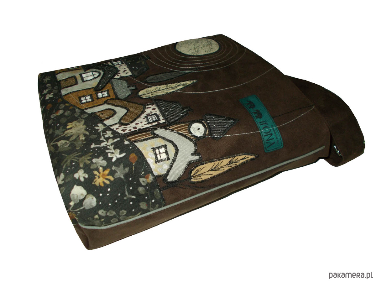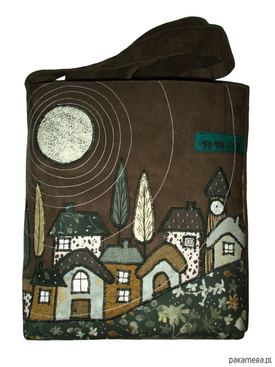 Autorska torba z eko zamszu. Pasek z regulacją, wzmocniony nitami, okucia srebrne. Przód zdobią aplikacje układające się w urokliwe miasteczko. Cała torba trzyma kształt. W szwach wypustka. Denko poszerzone. Całość zapinana na zamek. Jedna z wewnętrznych kieszeni jest również zapinana na zamek. Druga kieszeń pomieści telefon, długopis i notesik. szerokość 32cm, wysokość 30cm plus denko 8cm
