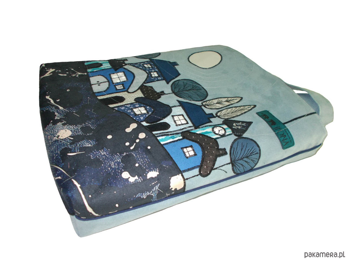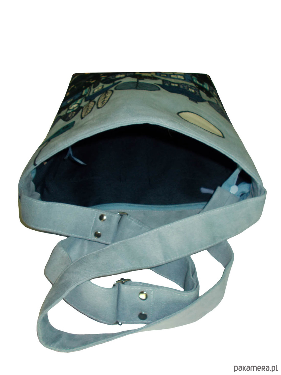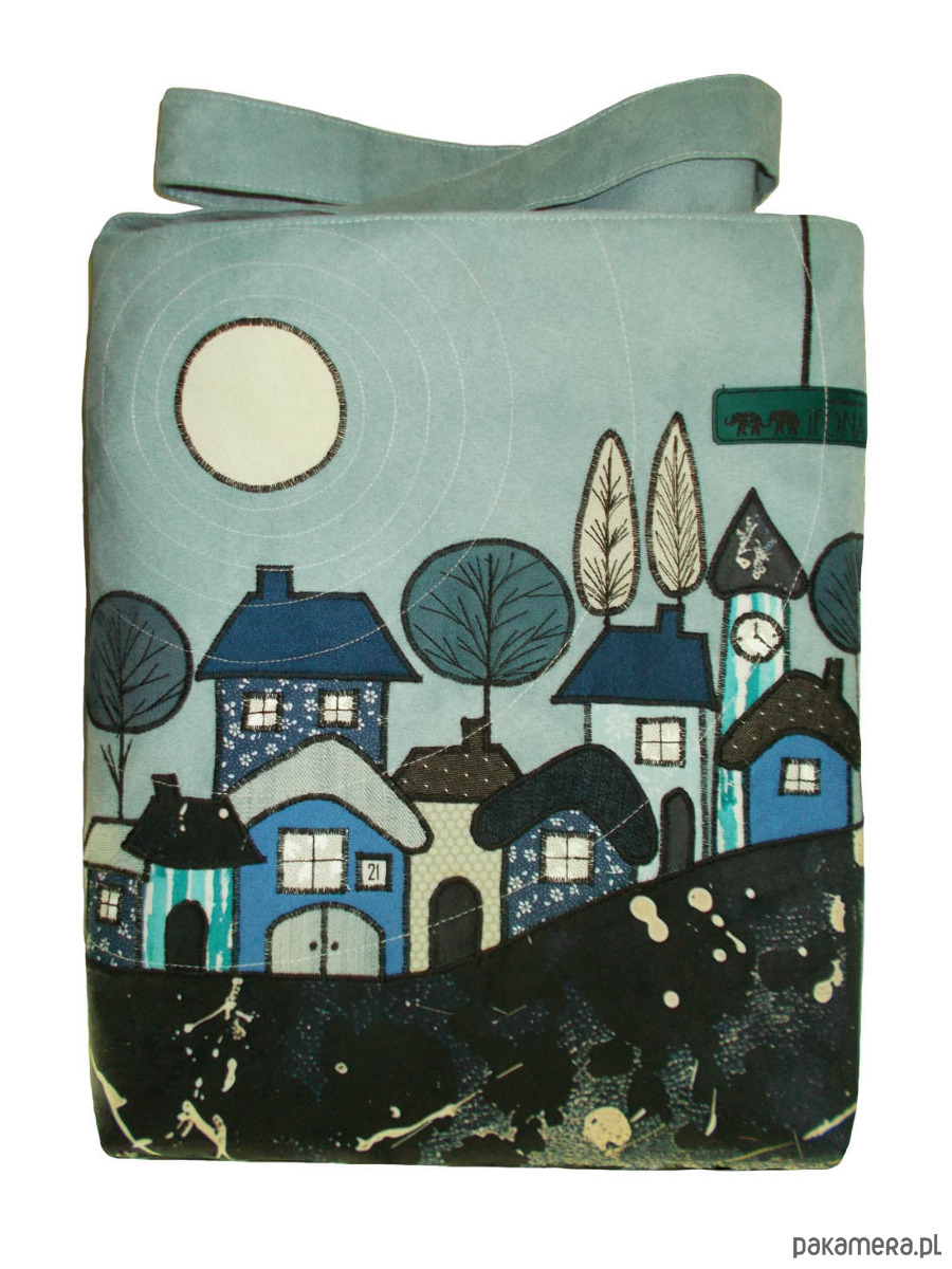 Autorska torba z eko zamszu mieszcząca format A4. Pasek z regulacją, wzmocniony nitami, okucia srebrne. Przód zdobią aplikacje układające się w urokliwe miasteczko. Cała torba trzyma kształt. W szwach wypustka. Denko poszerzone. Całość zapinana na zamek. Jedna z wewnętrznych kieszeni jest również zapinana na zamek. Druga kieszeń pomieści telefon, długopis i notesik. szerokość 38cm, wysokość 38cm plus denko 8cm