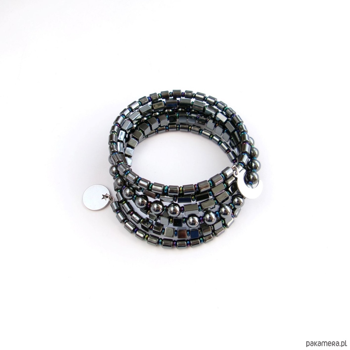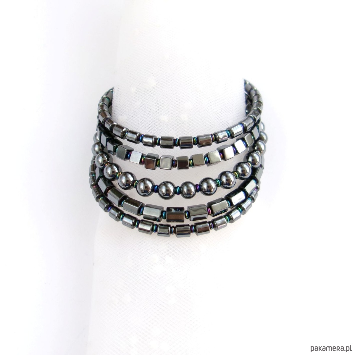Wielorzędowa bransoletka z koralikami hematytu w różnych kształtach, przekładanymi szklanymi oponkami.