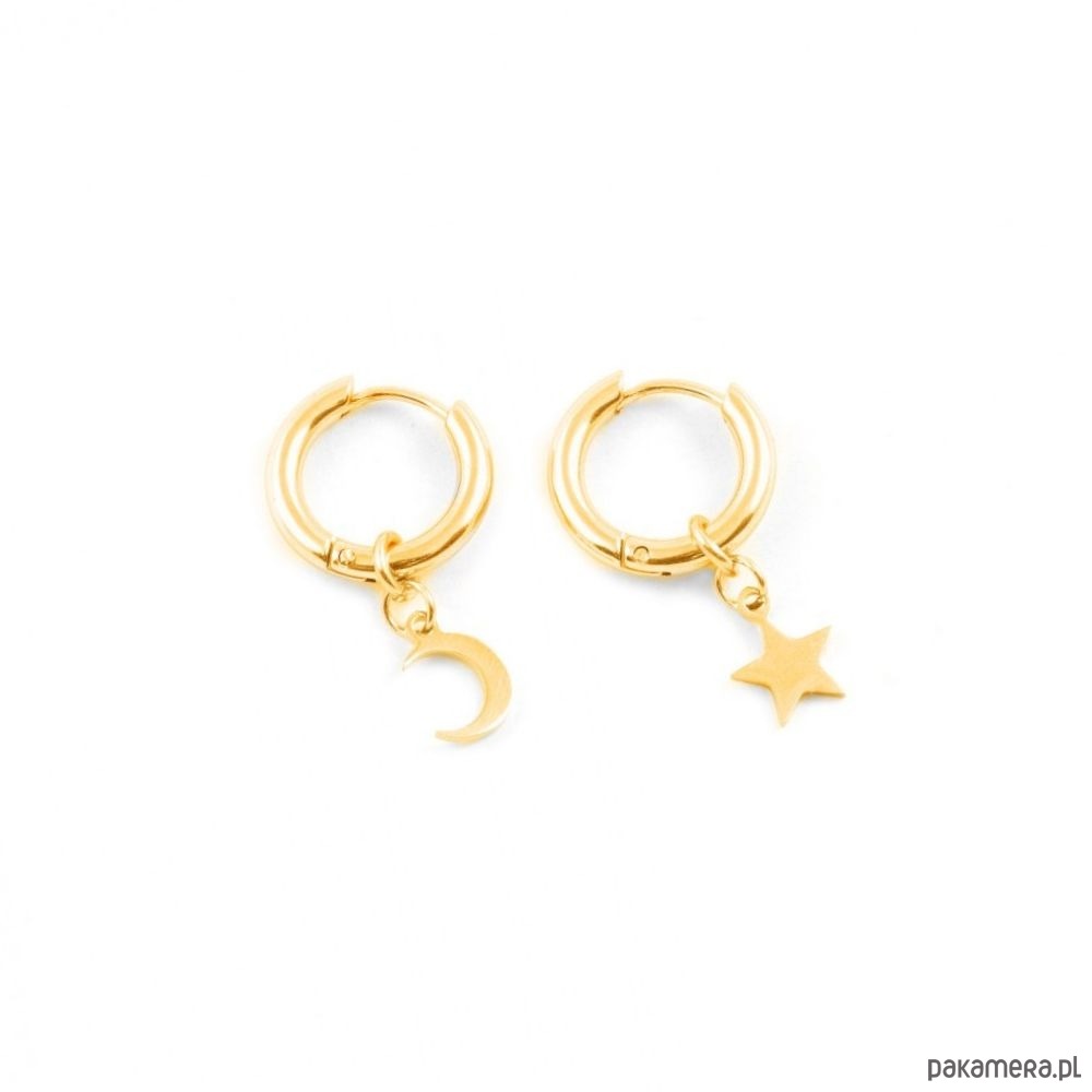 Złote koła z delikatnymi zawieszkami w kształcie półksiężyca i gwiazdki symbolizują równowagę i wewnętrzny spokój – światło i ciemność, marzenia i rzeczywistość. Ich minimalistyczna forma sprawia, że doskonale pasują do każdej stylizacji – zarówno tej codziennej, jak i wieczorowej.