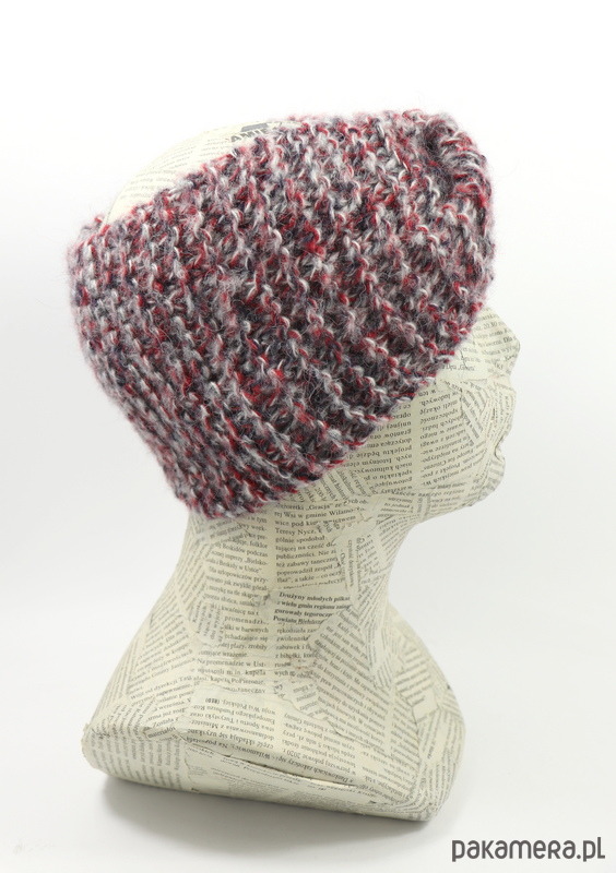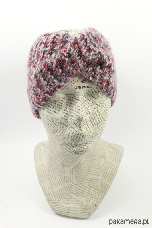Opaska zrobiona na drutach z cudownie mięciutkiej włóczki w kolorze szarym, granatowym, bordowym i ecru o składzie: akryl 75%, wełna 5%, poliamid 12%, angora 8% . Świetny retro dodatek do ubioru.
