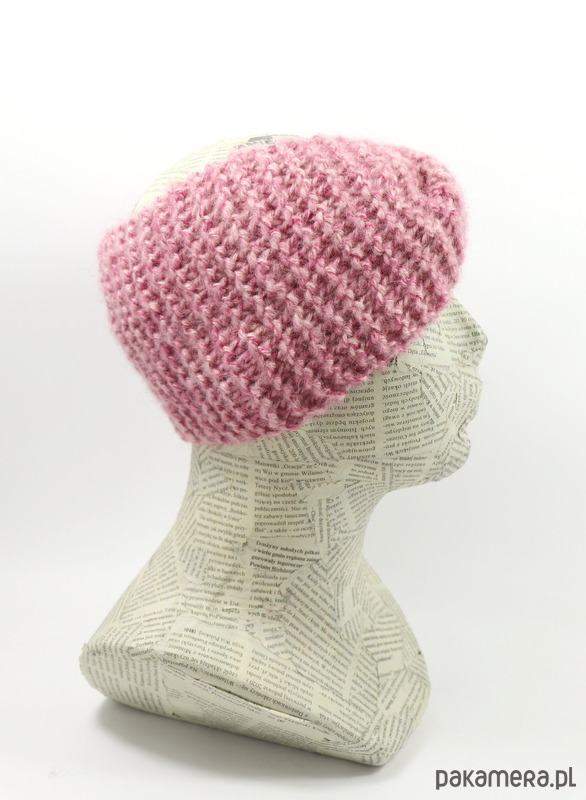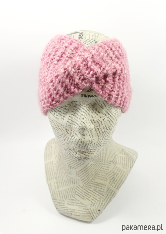 Opaska zrobiona na drutach z cudownie mięciutkiej włóczki w kolorze różowym o składzie: akryl 75%, wełna 5%, poliamid 12%, angora 8% .